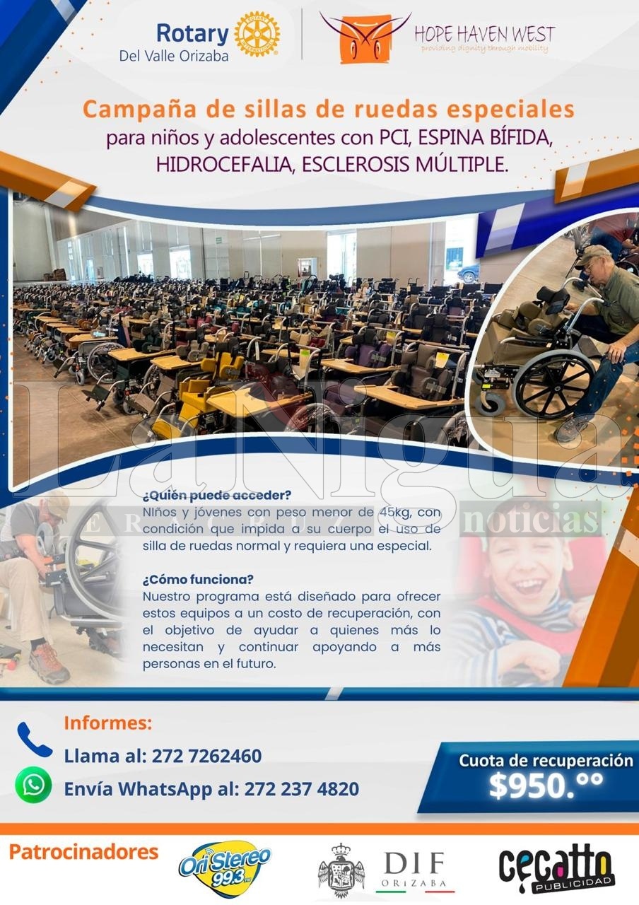 Orizaba, Ver.- La organización Hope Haven West, en colaboración con Rotary Valle de Orizaba, ha lanzado una campaña para la donación de sillas de ruedas especiales dirigidas a niños y adolescentes que padecen condiciones como parálisis cerebral infantil (PCI), espina bífida, hidrocefalia y esclerosis múltiple, entre otras.