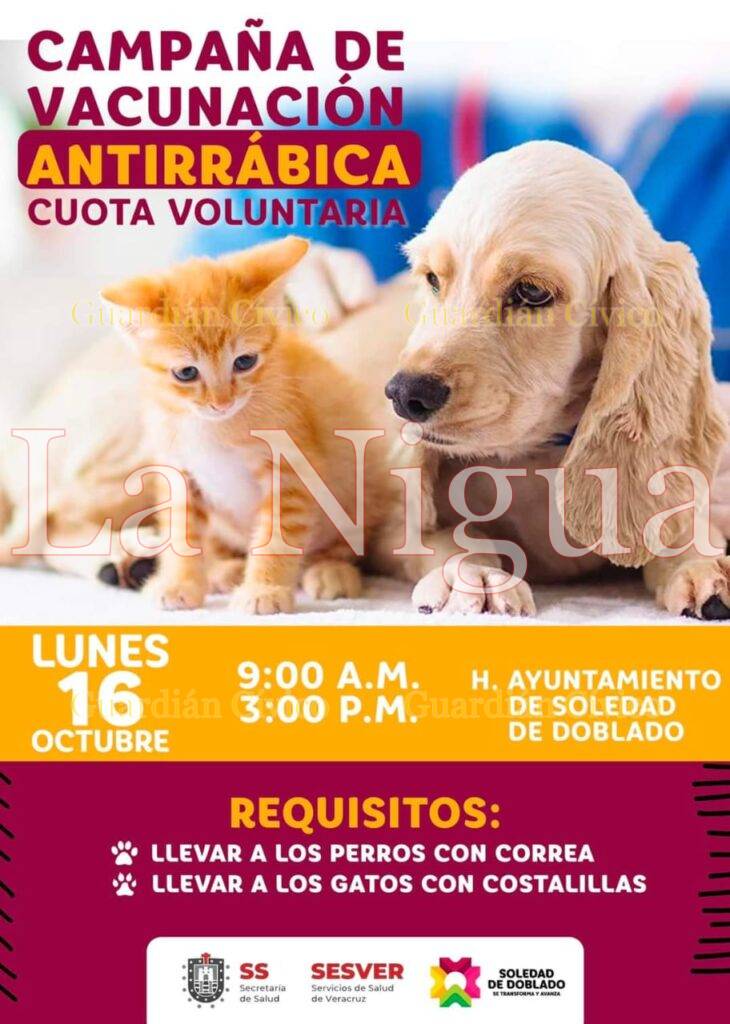 15 de Octibre 2023. El H. Ayuntamiento de Soledad de Doblado a través de la Dirección de Ecología y Medio Ambiente, invita a toda la ciudadanía a la campaña de vacunación antirrábica para el bienestar de nuestras mascotas.