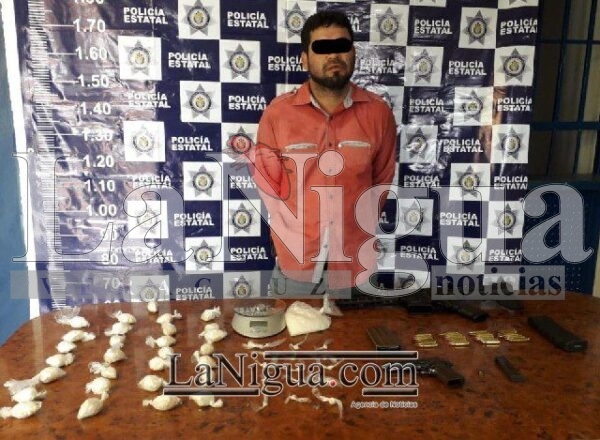 Al detenido, le fueron además asegurados: 29 envoltorios con cuadros blancos, al parecer cristal; 15 cuadritos envueltos, también al parecer de cristal; una bolsa con una sustancia desconocida de 500 gramos aproximadamente; una báscula sin marca; un celular negro moto g5; un arma corta con numeración 707892, marca Llama, calibre 380; un cargador abastecido con un solo cartucho; un arma larga mod. ST15, sin matrícula, con dos cargadores (uno de color negro plástico y otro metálico) y 28 cartuchos calibre 223; así como un arma corta marca Colt.