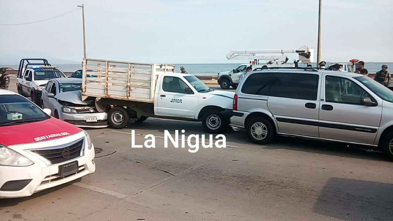 El choque por alcance se llevó a cabo cuando el conductor de una camioneta Venture, color plateada, venía de poniente a oriente sobre el Malecón y frenó sin previo aviso, provocando que una camioneta de redilas, color blanca que venía a exceso de velocidad se impactará y a su vez un Gol, color plateado colisionara y terminara debajo de la camioneta de redilas.