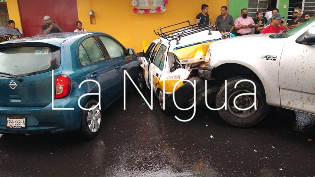 Al llegar a la calle 3, se impacto por alcance contra un Taxi Tsuru número económico CO-1903, el cual se impacto contra un automóvil Nissan March color azul.