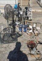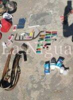 Adicionalmente se hallaron cinco tijeras, 18 encendedores, 50 gorras de béisbol, 10 pares de zapatos, cuatro cinturones, 12 pantalones obscuros, 29 playeras obscuras, 15 chamarras y una carriola porta bebé.