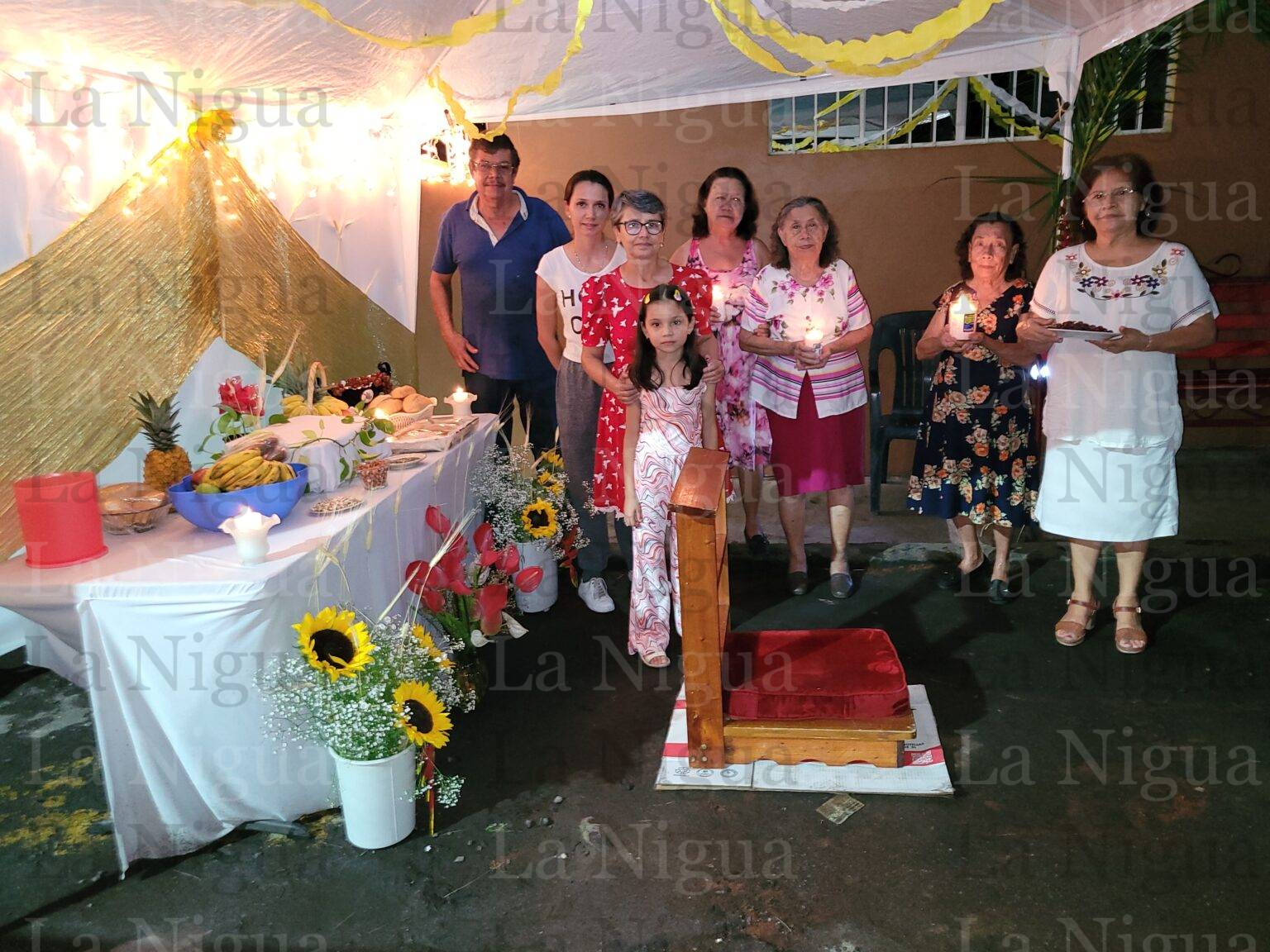 Familias pusieron altares con flores, frutas y adornos de papel, para recibir a los feligreses en cada parada donde oraban en todo el recorrido. Otras personas colocaban veladoras si re la acera, para iluminar la peregrinación