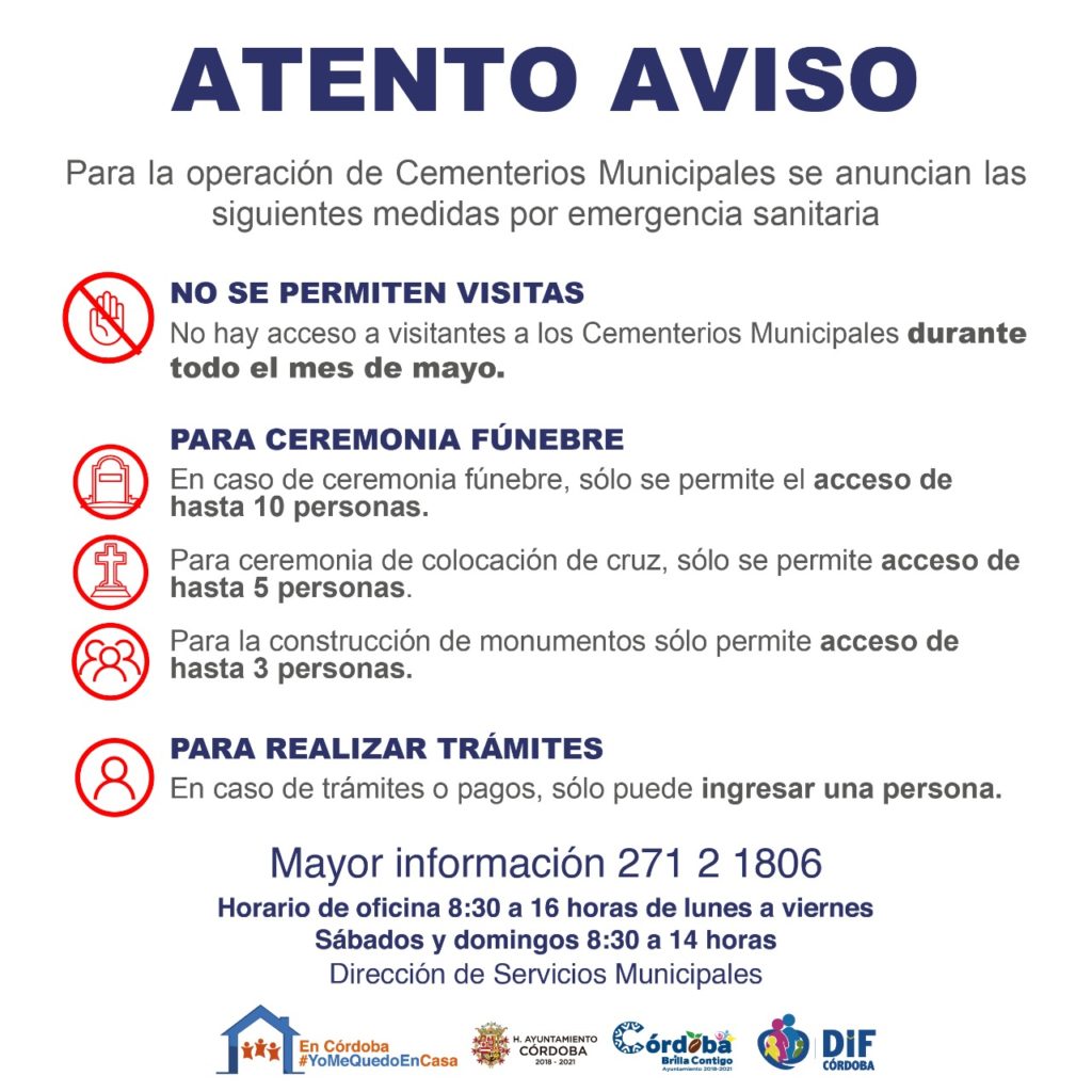 Córdoba, Ver.- La Coordinación de Panteones del Ayuntamiento de Córdoba informó que durante el mes de mayo no se permitirá el acceso de visitantes a los Cementerios Municipales en atención a las medidas por emergencia sanitaria.