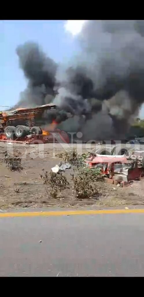 Tierra Blanca, Ver.- Un tractocamión se incendió por completo además de impactar otra unidad donde indican viajaba una familia, terminando accidentados sobre el kilómetro 53 de la autopista Tinajas-Ciudad Isla.