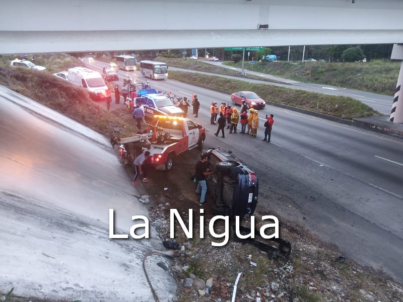 Córdoba, Ver.- Con golpes en diferentes partes del cuerpo resultaron los tripulantes de dos autos, luego de un choque con volcadura en el kilómetro 298 de la autopista Puebla-Córdoba.
