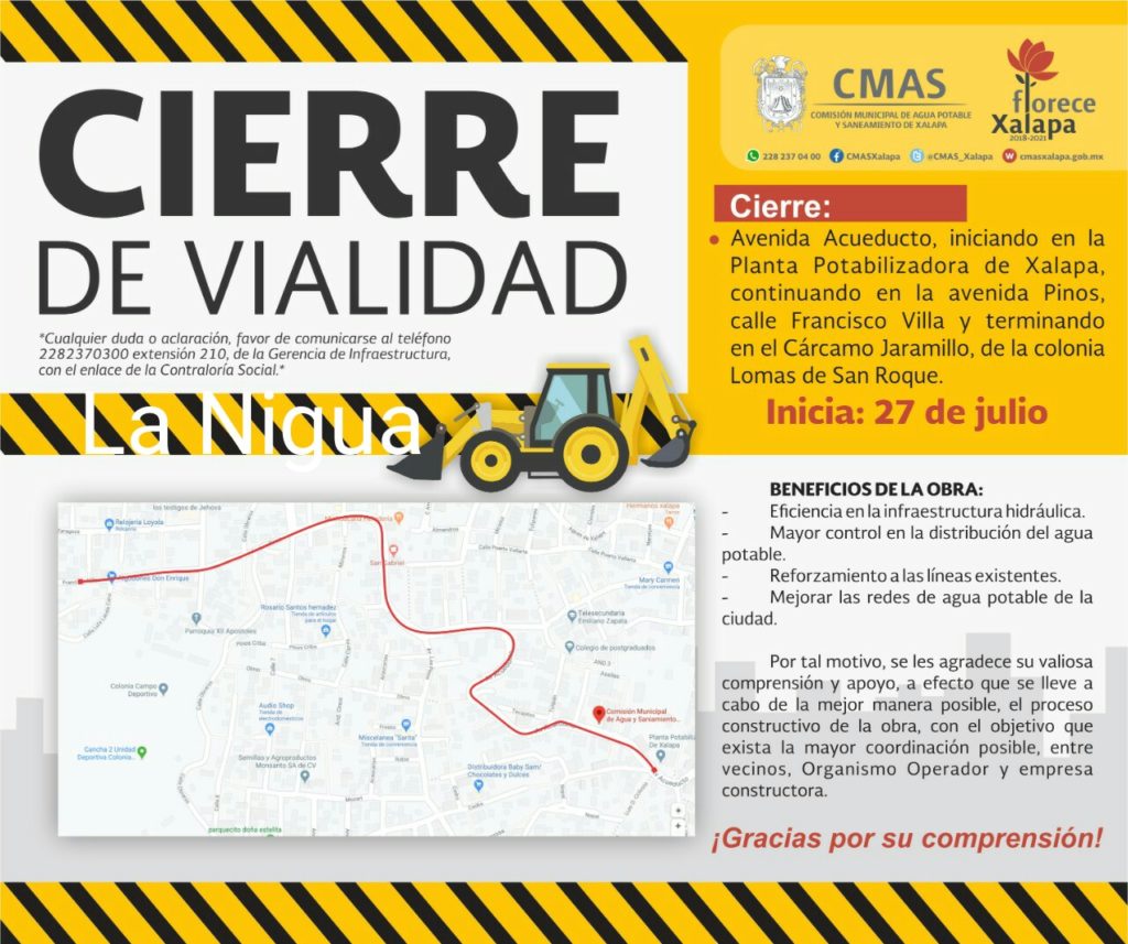 Xalapa,Ver.-Por los trabajos de excavación de zanja de la obra de Sectorización Hidráulica en su segunda etapa que realizará la Comisión Municipal de Agua y Saneamiento de Xalapa (CMAS), a partir del lunes 27 de julio, se interrumpirá parcialmente las vialidades en las avenidas Acueducto y Diamante, y en la calle Lucio García Ochoa.