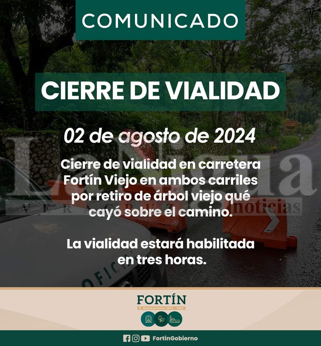FORTÍN DE LAS FLORES, VER.- El Ayuntamiento de Fortín ha anunciado en su página oficial que el Camino de “Fortín Viejo” estará cerrado durante tres horas debido a labores de retiro de un árbol. Esta operación impedirá la circulación en ambos carriles.