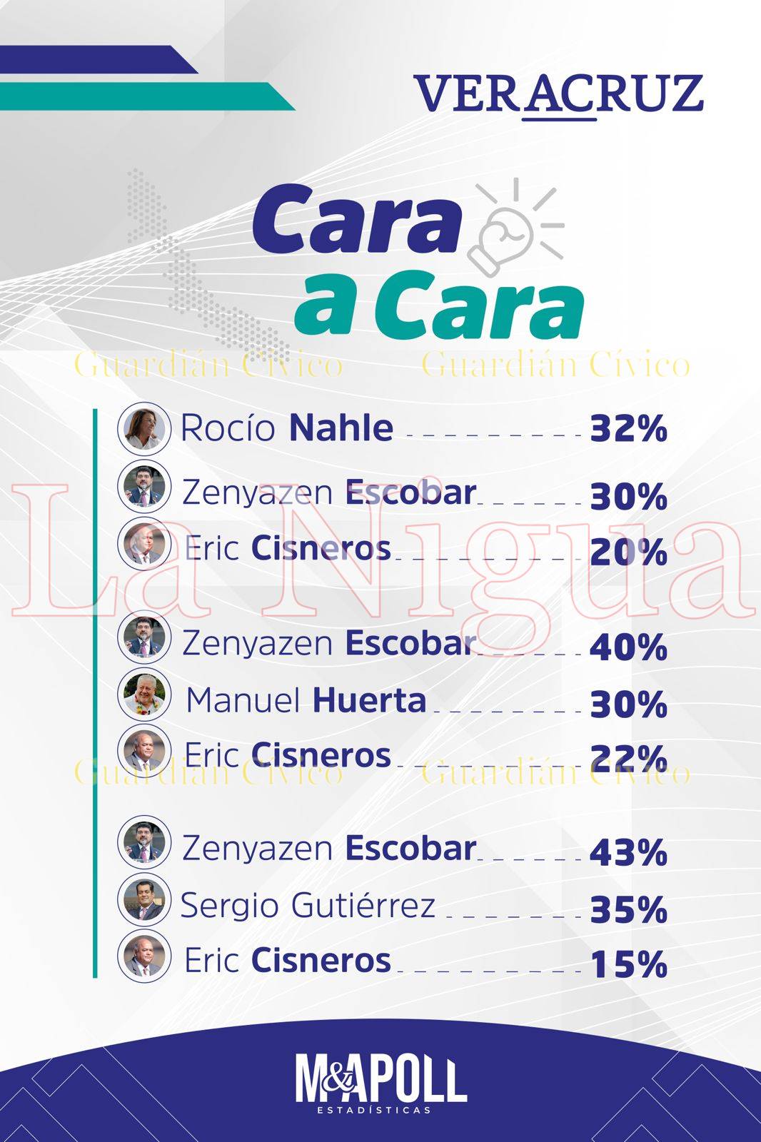 En un primer escenario, se nombran a Rocío Nahle con 32 por ciento, a Zenyazen Escobar con 30 por ciento y a Eric Cisneros con 20 por ciento; en el segundo, Zenyazen Escobar llega al 40 por ciento, Manuel Huerta al 30 por ciento y Eric Cisneros al 22 por ciento, y en una tercera opción, Zenyazen Escobar cuenta con el 43 por ciento de votación, Sergio Gutiérrez el 35 por ciento y Eric Cisneros el 15 por ciento.