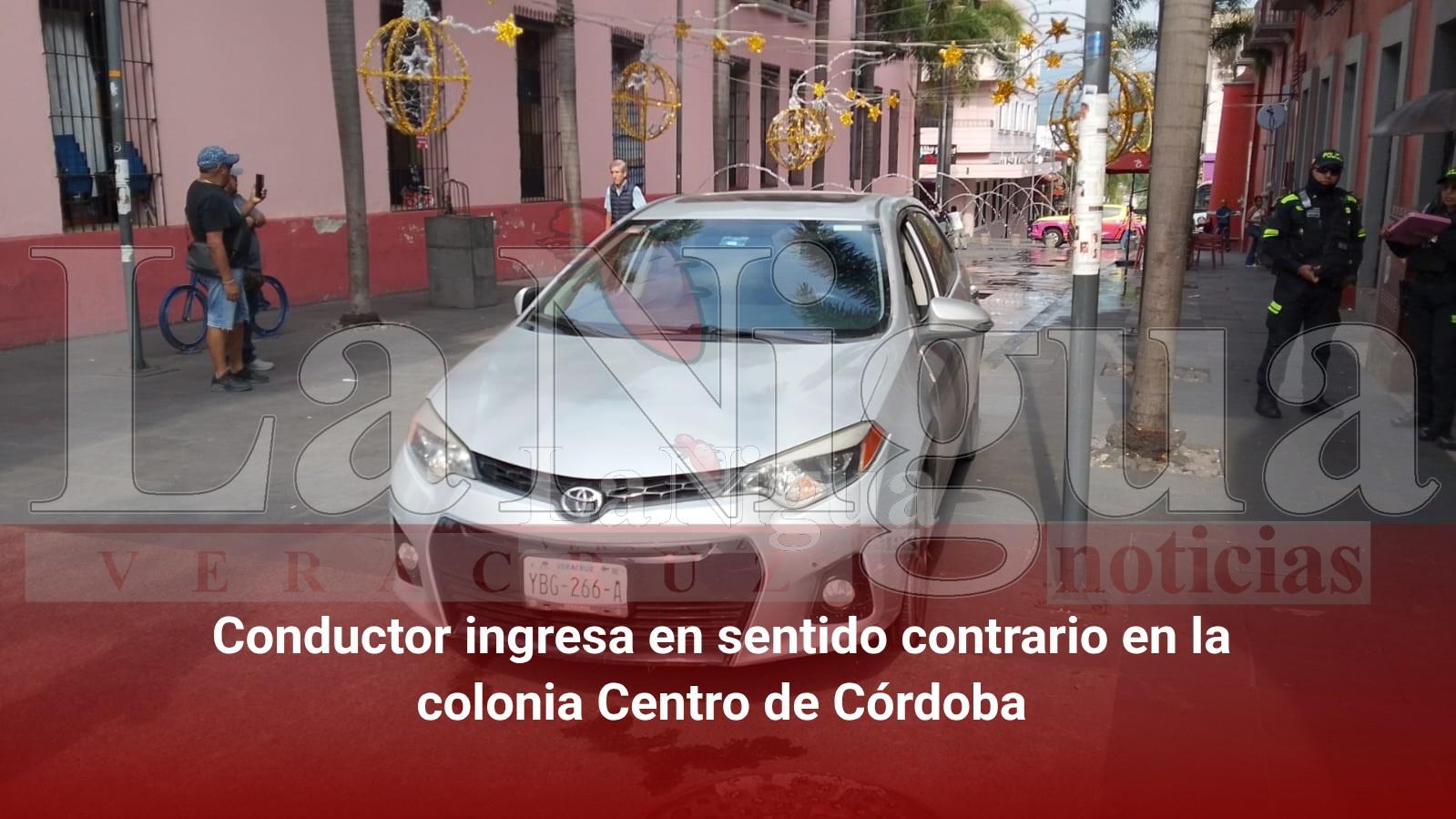 CÓRDOBA, VER.— La tarde de este miércoles, un conductor que transitaba a bordo de un vehículo Toyota Corolla, color gris, provocó la movilización de autoridades luego de ingresar en sentido contrario sobre la calle 1, entre avenidas 1 y 2, en la colonia Centro de esta ciudad.