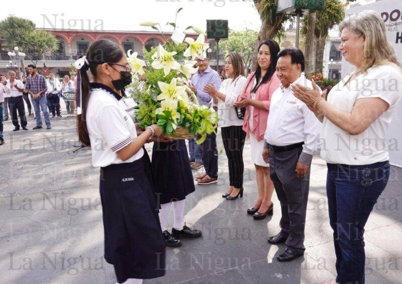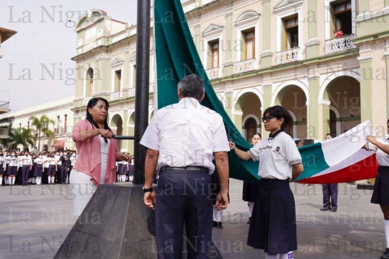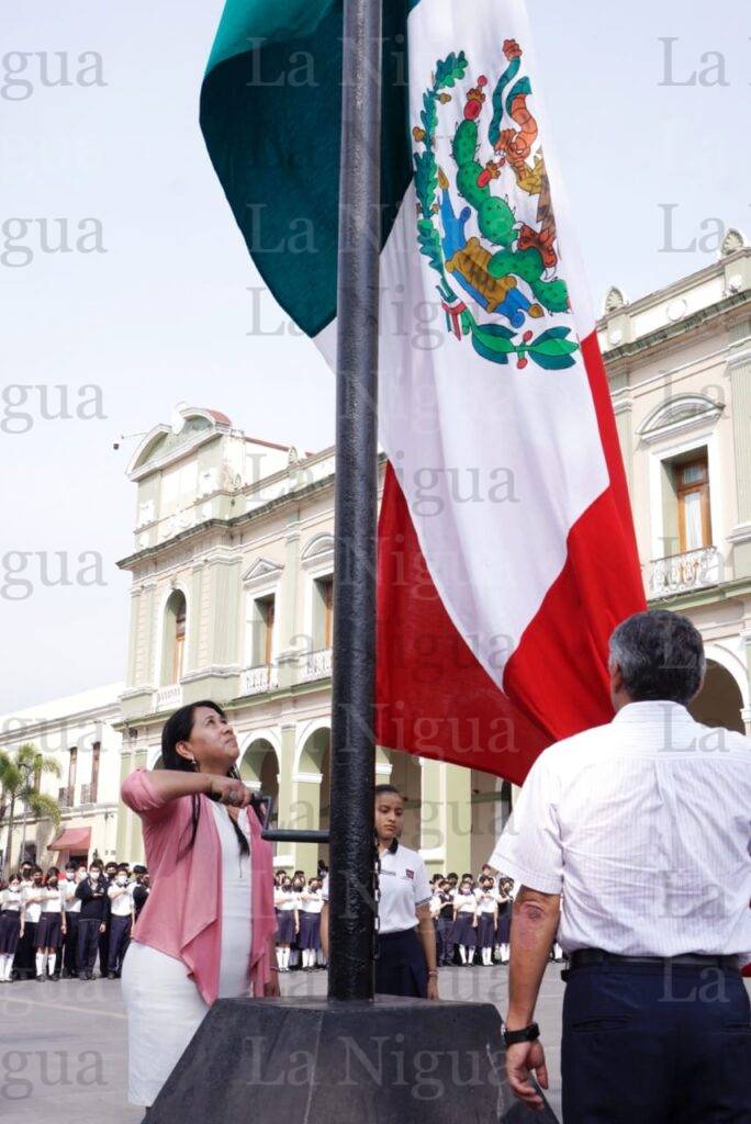 El izamiento y los honores a la Bandera, estuvieron a cargo de la Regidora cuarta, María Luisa Martínez Ramírez, posteriormente, la alumna, Maredy Cobilt Sánchez dirigió el juramento al Lábaro Patrio.