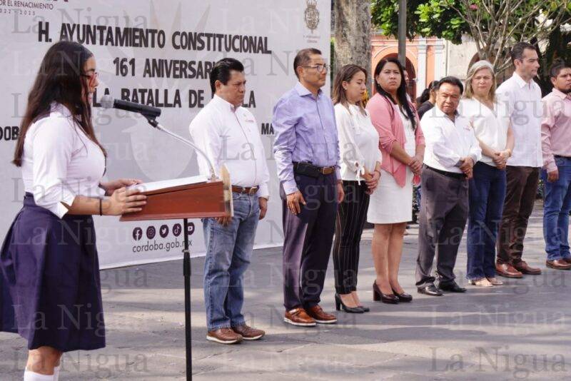 Córdoba, Ver., (05 de mayo de 2023).- Este viernes, autoridades municipales encabezadas por el presidente municipal, Juan Martínez Flores, llevaron a cabo un acto cívico para conmemorar el 161 Aniversario de la Batalla de Puebla de 1862, a cargo de los alumnos de la escuela Centro de Estudios Superiores de Córdoba (C.E.S.C.O).