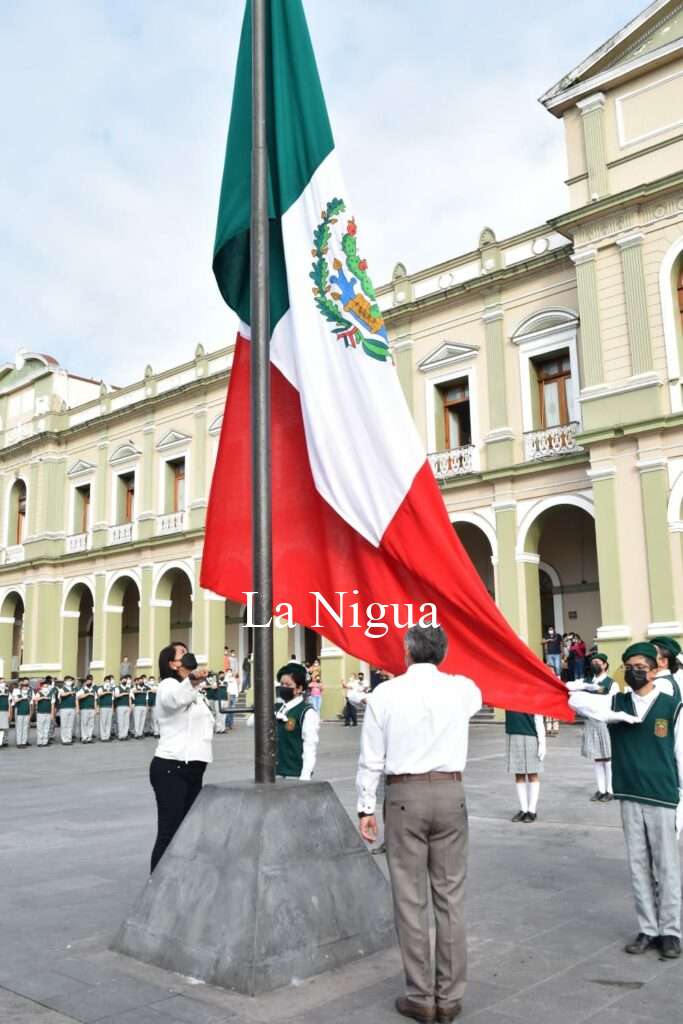 La regidora cuarta, María Luisa Martínez Ramírez, estuvo a cargo del izamiento de la Bandera, posteriormente, la alumna Daniela García Martínez participó con el juramento al Lábaro Patrio.
