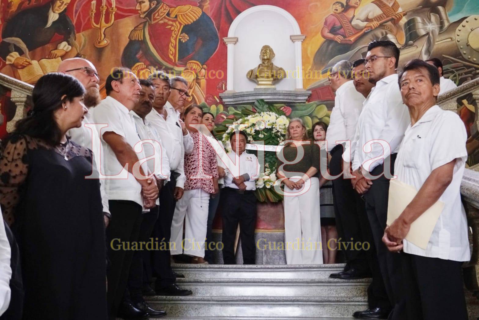 Al concluir el acto cívico, los integrantes del Cabildo y de la Masonería colocaron la ofrenda floral en el busto de Benito Juárez ubicado en el interior del Palacio Municipal, donde se llevó a cabo el toque de silencio.