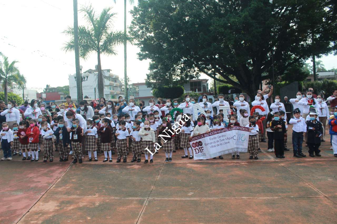 La escuela Telesecundaria Gabriel García Márquez de la comunidad de Coapichapa estuvo a cargo de los honores a la bandera asimismo los alumnos del Centro de Atención Comunitario CAIC representaron este hecho histórico durante el acto cívico.