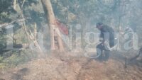 Atoyac, Ver.-Bajo intenso sol y contra el viento y el tiempo, personal del Ayuntamiento de Atoyac, trabaja apagando el incendio forestal en el cerro denominado Subida del Caracol, del lado oriente del Río Atoyac, detrás del Puenta Pensil, terreno límite con la comunidad Carrizal, del municipio de Paso del Macho.