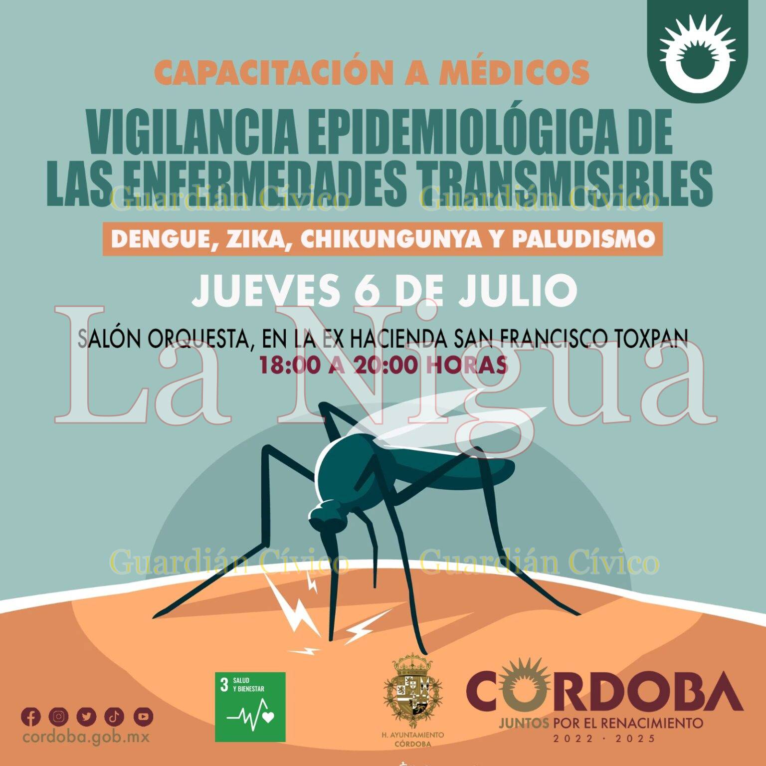 Córdoba, Ver., (05 de julio de 2023). – El Ayuntamiento de Córdoba a través de la Coordinación de Salud y la Jurisdicción Sanitaria 6 convocan a médicos particulares del municipio y de la región para acudir a la capacitación “Vigilancia Epidemiológica de las Enfermedades Transmisibles por Vector: dengue zika, chicungunya y paludismo”, que se realizará en la Ex Hacienda Toxpan este jueves 6 de julio a las 18:00 horas.