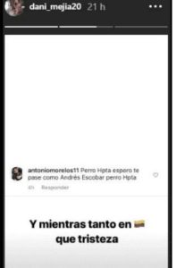 Daniela Mejía, su esposa del futbolista, compartió el mensaje que llegó a su cuenta de Instagram en la que mostraba una captura de pantalla de un tuit en el que un usuario deseaba a Tesillo lo ocurrido a Andrés Escobar, defensa central de la Selección Colombia asesinado en 1994, tras cometer un autogol en el Mundial en Estados Unidos.