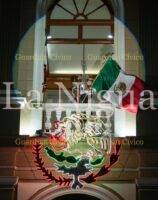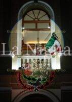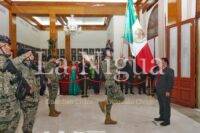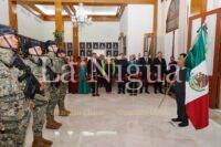 A las 11:10 de la noche, la primera autoridad hizo su arribo hacia el Salón Central para recibir la Bandera de México de manos de la escolta conformada por elementos de la Secretaría de Marina, acompañado de los toques de la banda de guerra “30 Caballeros”.