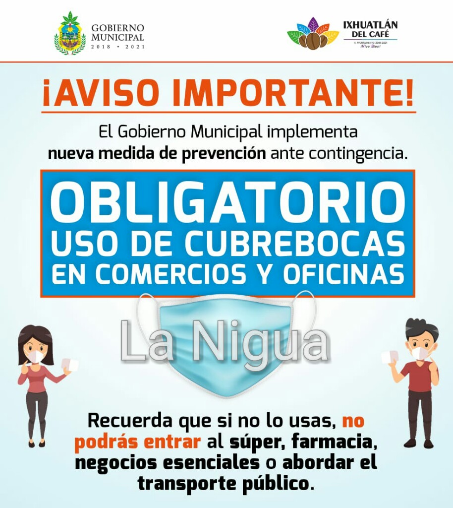Ixhuatlán Del Café.- A causa del regreso a semáforo rojo de prácticamente todo el estado de Veracruz anunciado por la Secretaría de Salud y para evitar más contagios por COVID-19 en el municipio, a partir de esta semana el uso de cubrebocas en comercios y oficinas será obligatorio; además se seguirán aplicando las restricciones en comercios, transporte público, oficinas, espacios públicos y deportivos.
