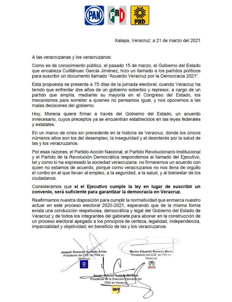 A las veracruzanas y los veracruzanos, como es de conocimiento público, el pasado 15 de marzo, el Gobierno del Estado que encabeza Cuitláhuac García Jiménez, hizo un llamado a los partidos políticos para suscribir un documento llamado “Acuerdo Veracruz por la Democracia 2021”.