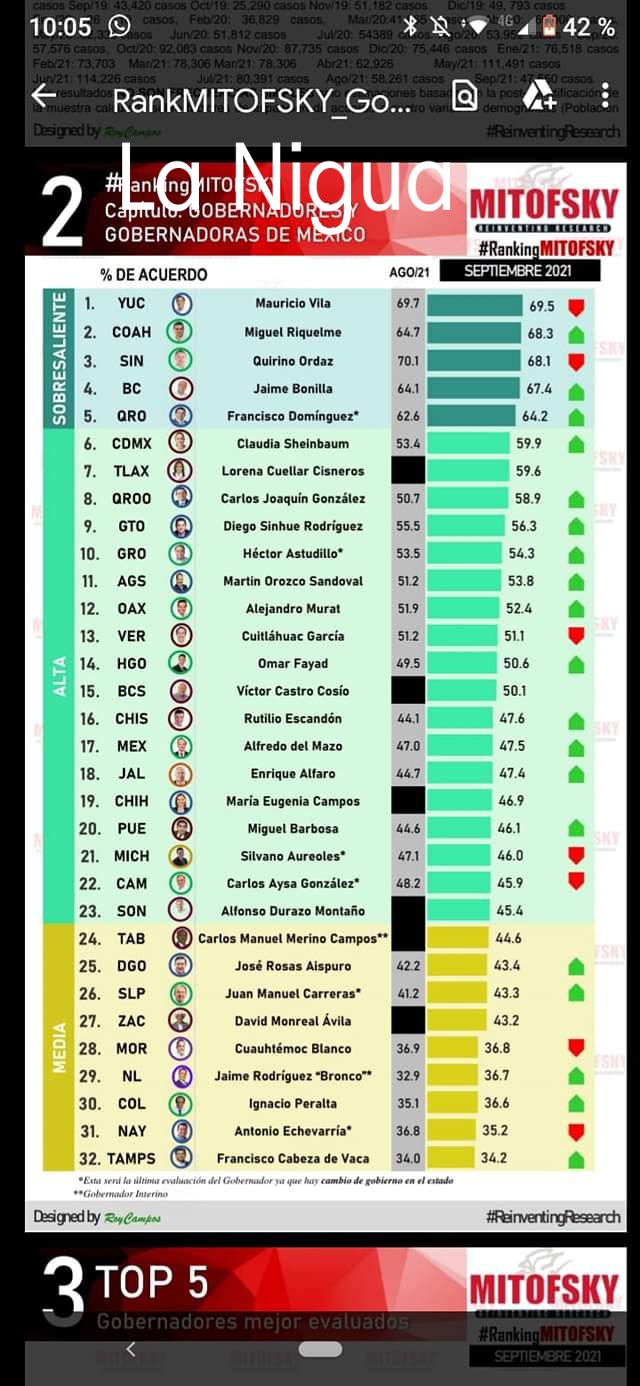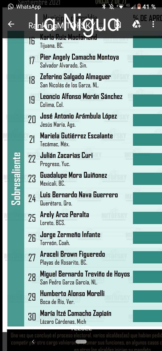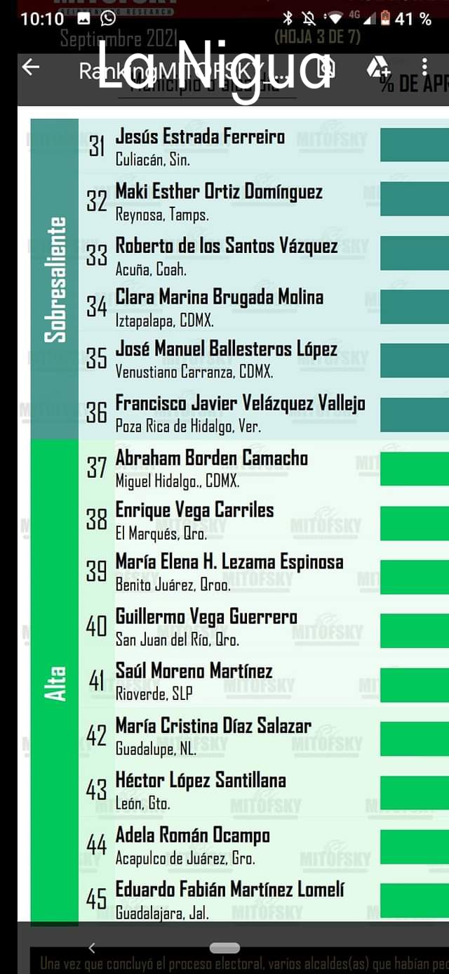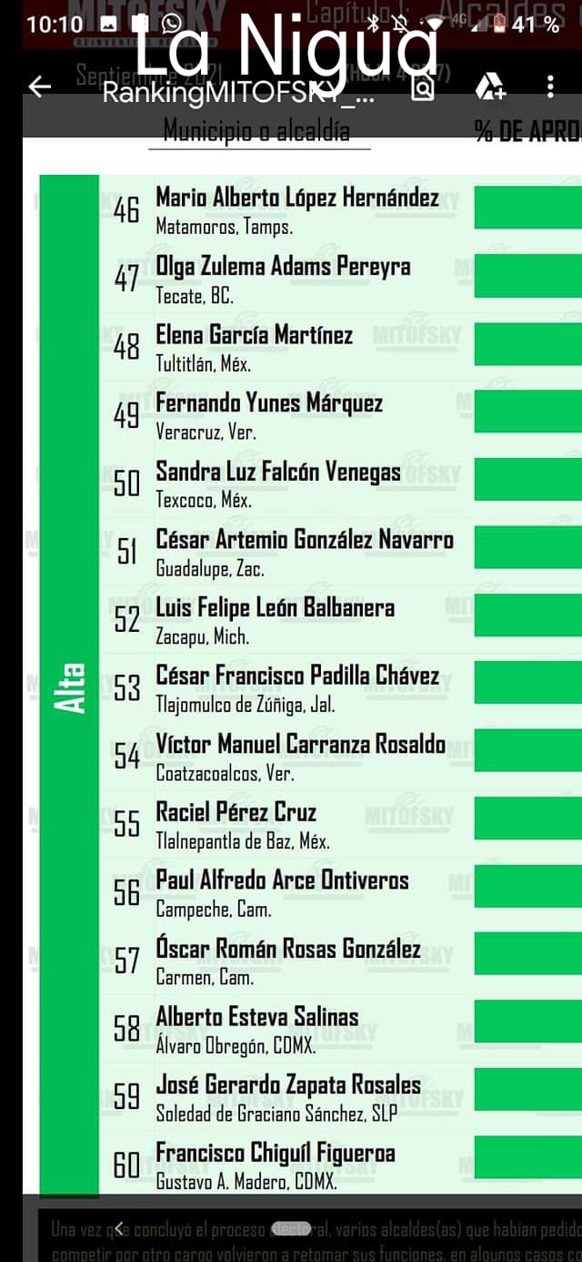 En septiembre pasado, cien alcaldes evaluados alcanzaron una aprobación trimestral promedio de 45%; el panista Jesús Antonio Nader Nasrallah, de Tampico, Tamaulipas, registró la aprobación más alta con 70.6%, y con 12% la morenista María Beatriz Hernández Cruz, de Salamanca, Guanajuato, se ubicó en el último sitio con 12 por ciento.