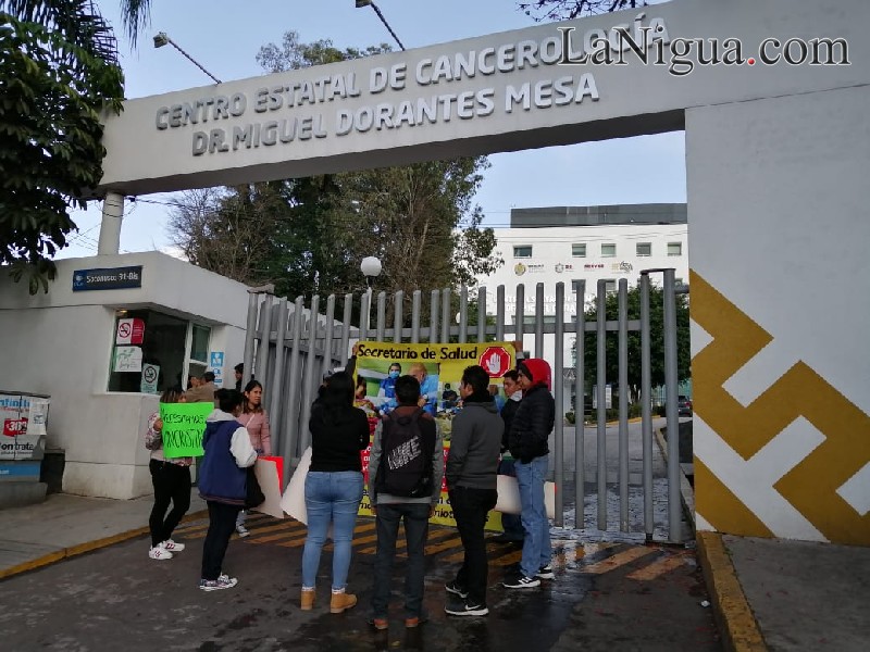 Xalapa, Ver.- Familiares de pacientes del área de pediatría del hospital Centro Estatal de Cancerología Dr. Miguel Dorantes Mesa, ubicado en la calle Soconusco 31 Bis de la colonia Aguacatal de la ciudad de Xalapa, se están manifestando en la entrada principal, pues a decir de la señora Karla Arias, madre de una niña de tres años del municipio de Minatitlán, no hay medicamentos.