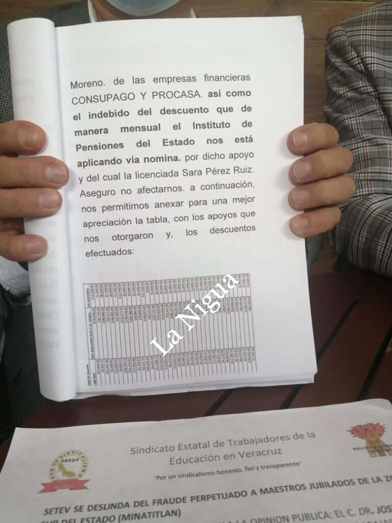 “Por lo consiguiente, hago público mi inconformidad, y condena, al fraude cometido con las compañías financieras CONSUPAGO Y PROHOGAR, perpetrados principalmente por la Licencaida Sara Pérez Ruiz entre otros que resulten responsables en contra de nuestros agremiados, a los cuales ya hicimos denuncia ante la fiscalía en contra de esta licenciada, por el delito de fraude en agrevio de los docentes y personal jubilados, ocurridos en el período de octubre, noviembre y diciembre de 2021, así mismo realizamos con la ratificación de la denuncia y carpeta de investigación con fecha 4 de julio 2022, con esto queremos dejar bien claro, particularmente a nuestros agremiados y hoy agraviados, que, en el SETEV, siempre velaremos por su bienestar y derechos apegados a nuestros estatutos, y basados en nuestros principios y valores, que siempre nos han caracterizados”.
