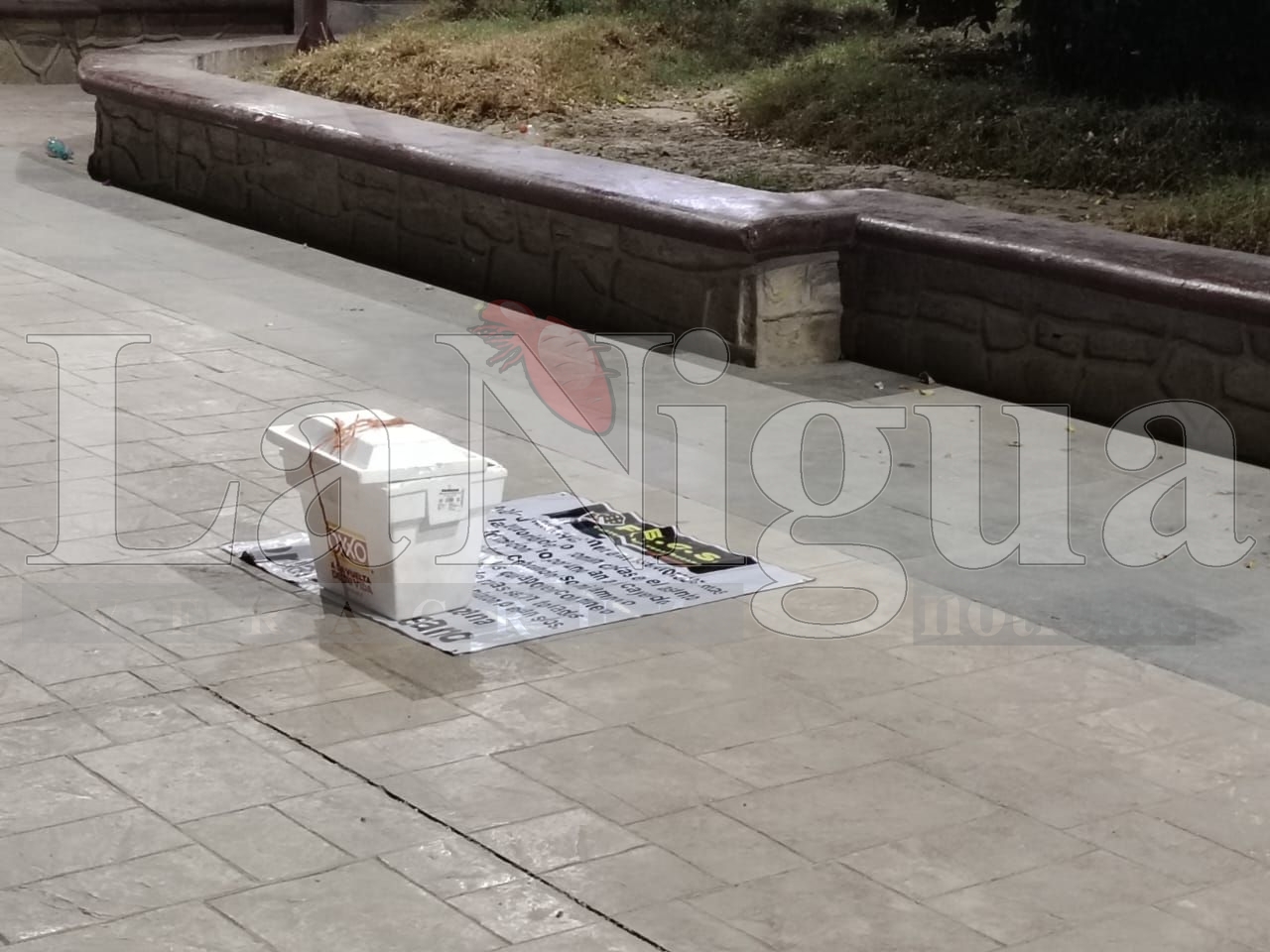 Fue alrededor de las 22:25 horas en que se dió a conocer este reporte de personas que caminaban en el parque municipal notificaron a la policía el hallazgo de esta hielera.