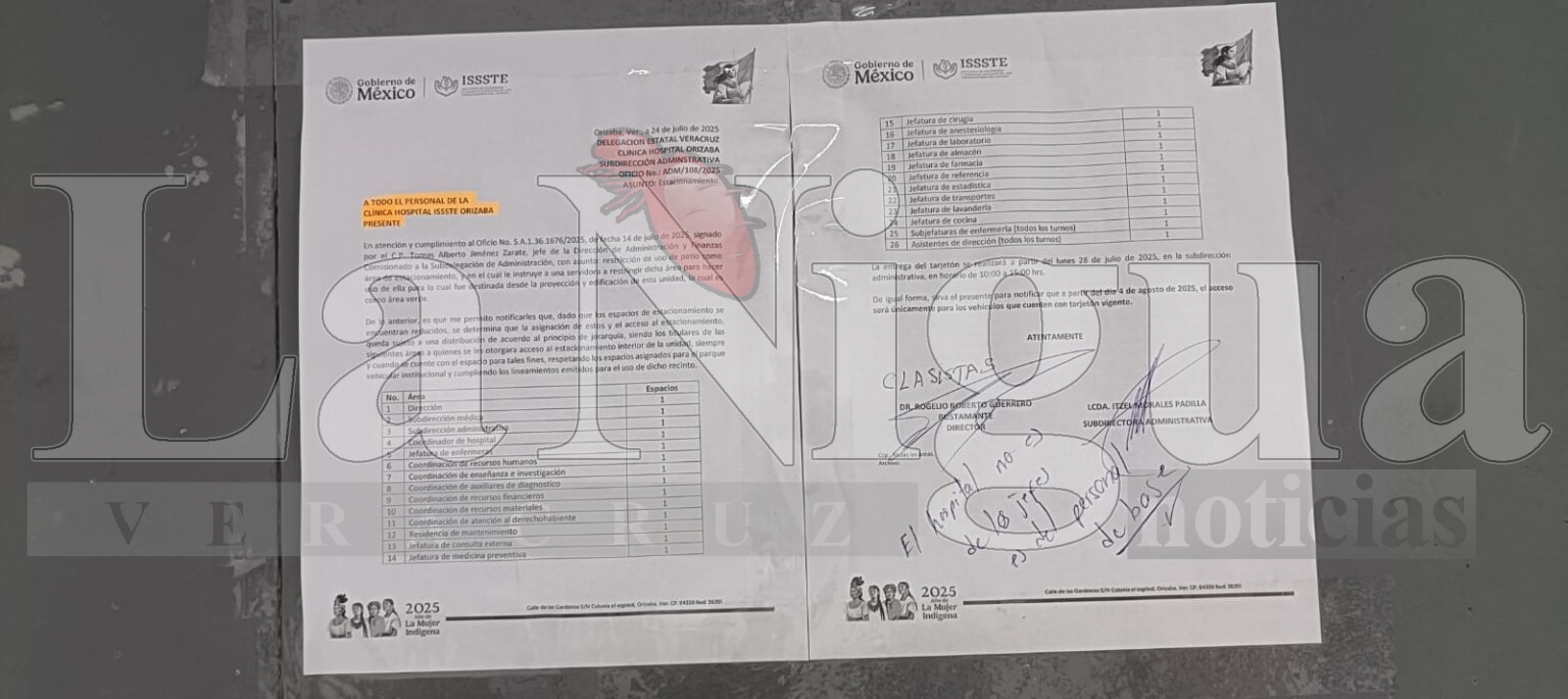Orizaba, Ver.- Trabajadores de base del Instituto de Seguridad y Servicios Sociales de los Trabajadores del Estado (ISSSTE), adscritos a la clínica-hospital de Orizaba, denunciaron que a partir del próximo lunes se les prohibirá el acceso al estacionamiento oficial del nosocomio, una medida que califican como injusta y discriminatoria.