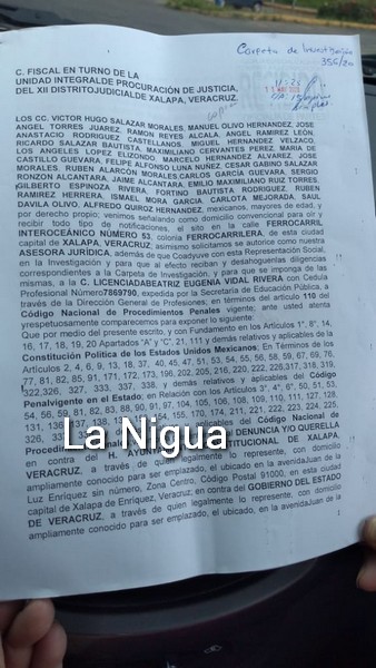 Xalapa, Ver.- Por los presuntos delitos de abuso de autoridad, robo, amenazas, tentativa de privación ilegal de la libertad y los que resulten, fueron denunciados ante la Fiscalía Anticorrupción, los directores municipales de Gobernación y de Seguridad Pública, Juan Vergel Pacheco y Francisco Villa Campa, así como al licenciado Carlos Ambrosio Yáñez Guerrero, asesor del ayuntamiento de Xalapa y una persona que solo saben que se llama Marisol, funcionaria se la Subsecretaría se Gobierno y representante del gobierno estatal.