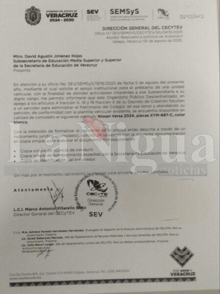 Asimismo, se acusa a Murrieta Esquivel de solicitar de manera irregular un vehículo Nissan Versa 2024 al Colegio de Estudios Científicos y Tecnológicos del Estado de Veracruz (CECYTEV) bajo la figura de “comodato” para uso personal, sin el conocimiento de la SEV.