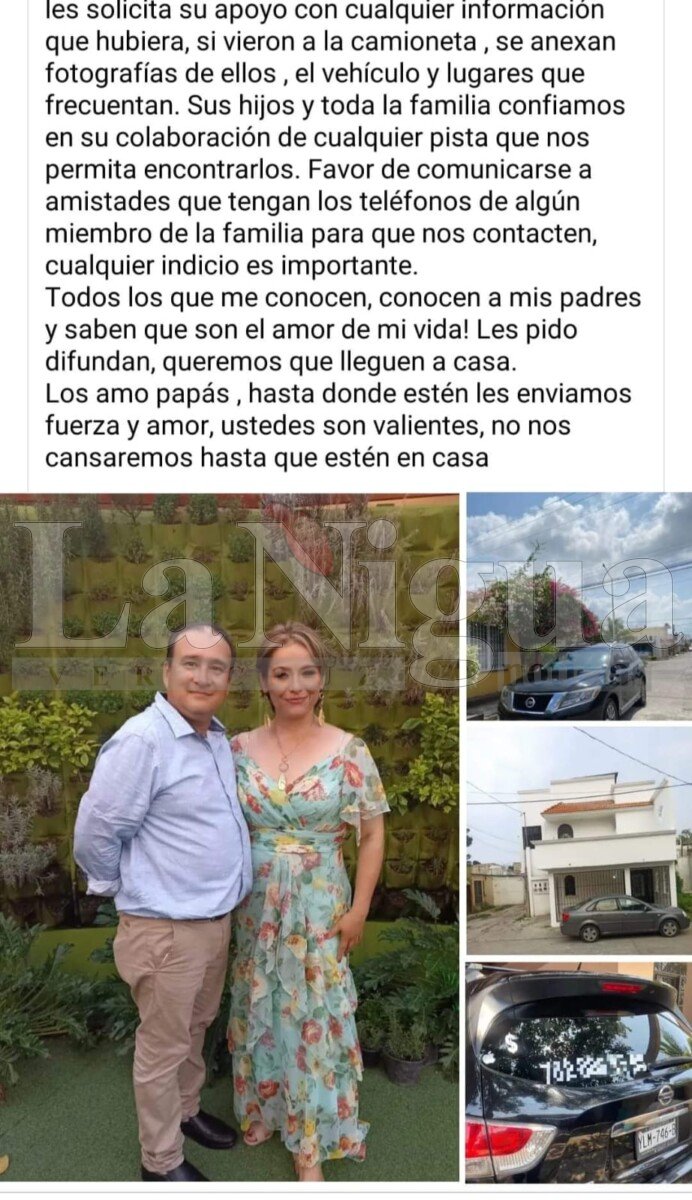 El último reporte, que iban a la colonia a División de Oriente , manifestó su familiar, agradeciendo su apoyo con cualquier información que hubiera, si vieron a la camioneta , anexando fotografías de la pareja junto con la unidad motriz.