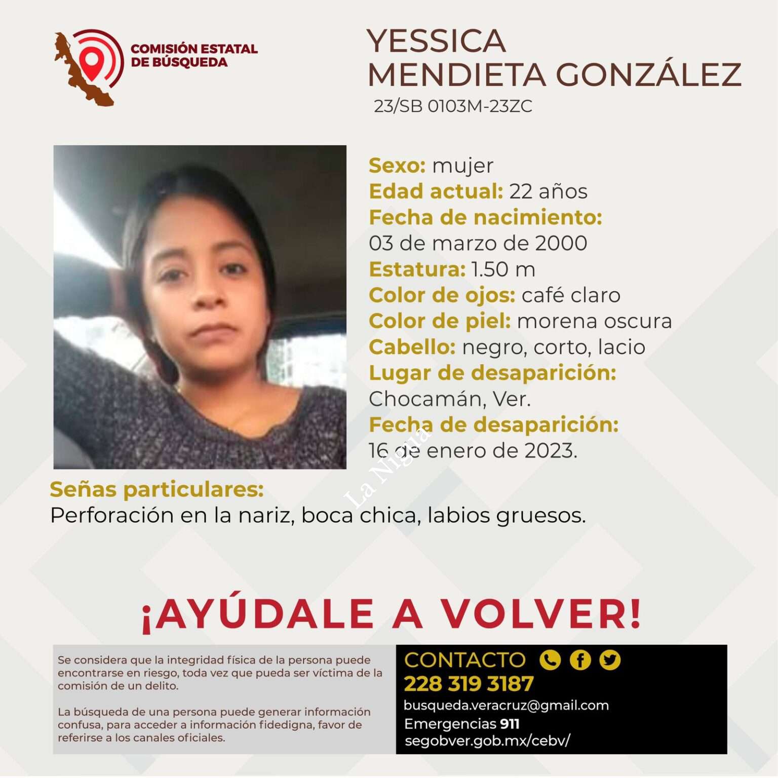 Indicaron que la fémina responde por Yessica Mendieta González de 22 años, tiene 1.50 de estatura, Morena clara, cabello lacio negro, como seña tiene una perforación en la nariz.
