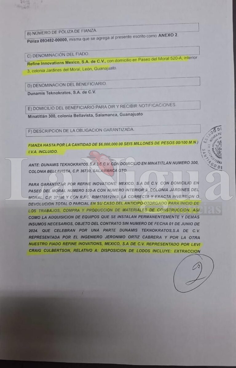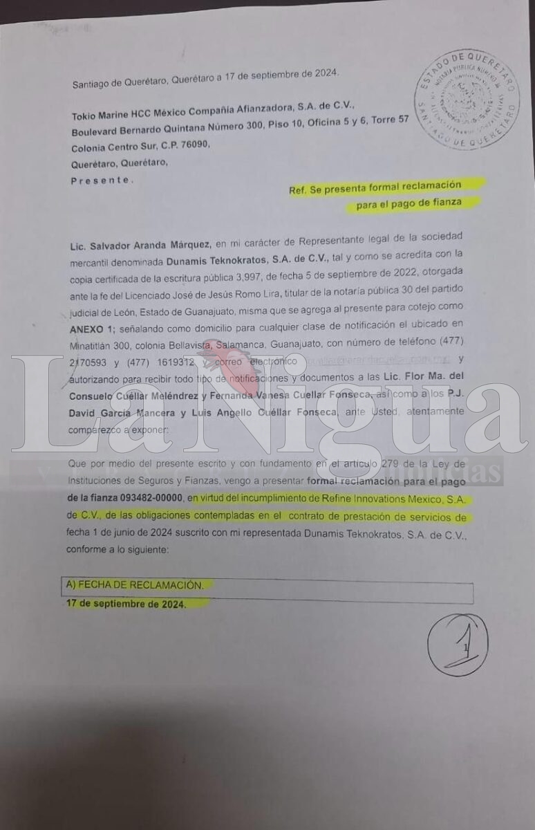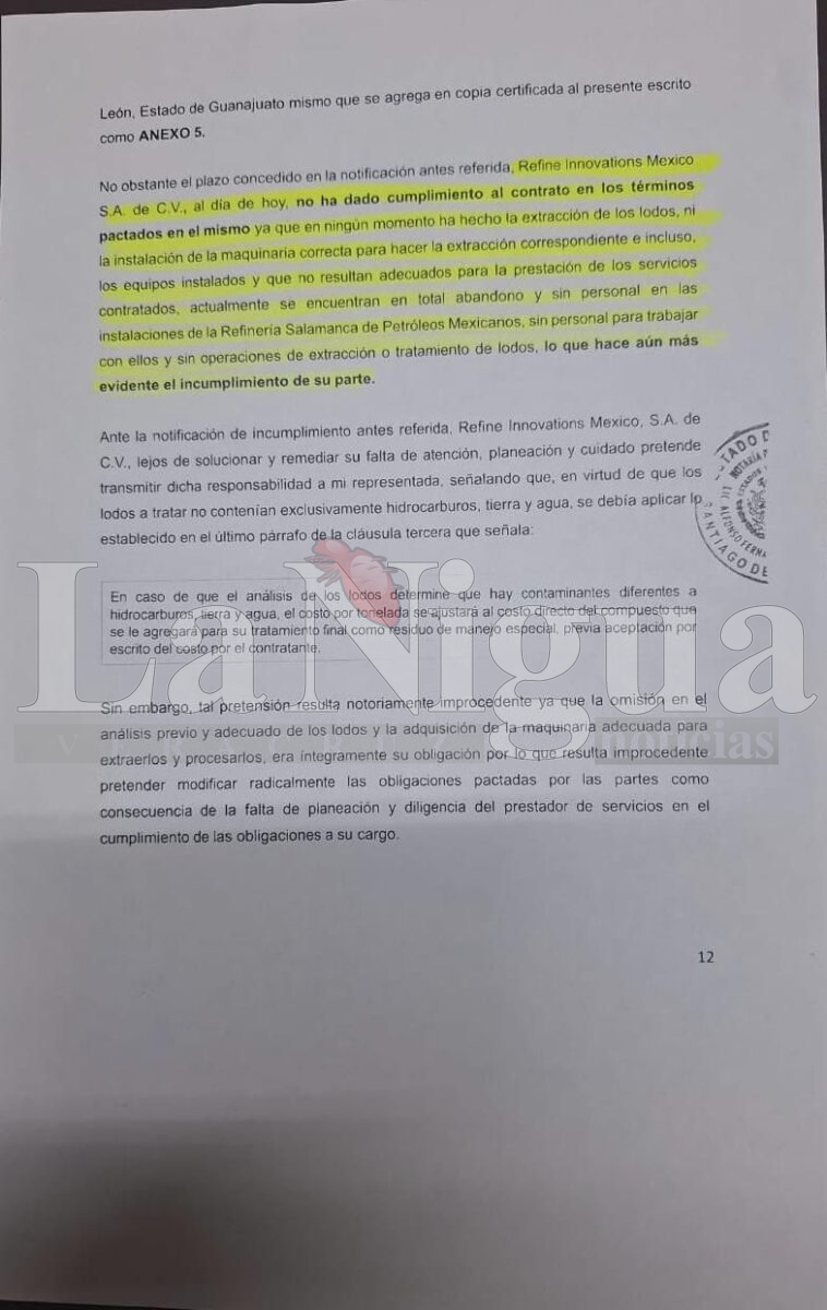 Información revelada a este comunicador, así como documentos legales recibidos —entre ellos una reclamación formal de fianza por $6,000,000.00 de pesos ante la aseguradora Tokio Marine HCC México—, evidencian el incumplimiento de contrato por parte de Refine Innovations en la ciudad de Salamanca, Guanajuato, donde dejó abandonada maquinaria inservible, sin personal ni operaciones, en las instalaciones de la Refinería de PEMEX. Según consta en el contrato firmado el 1 de junio de 2024, la empresa se comprometía a realizar la disposición de lodos contaminados, sin que hasta la fecha haya dado cumplimiento alguno.