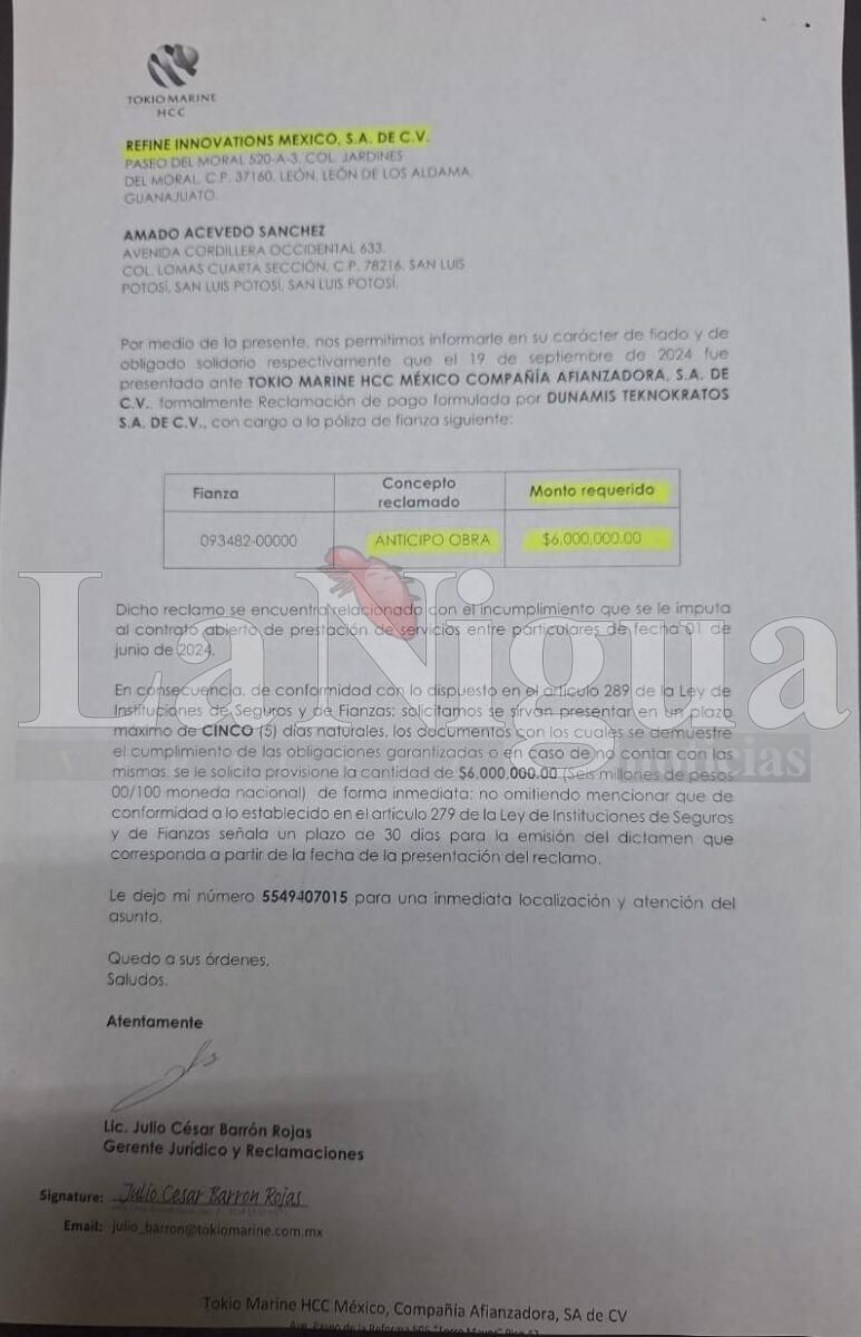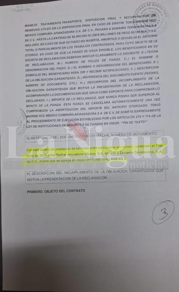 Los testimonios y documentos recibidos por este medio detallan cómo la fianza por seis millones de pesos garantizaba la correcta inversión o devolución del anticipo otorgado a Refine Innovations. Sin embargo, la falta de cumplimiento por parte del empresario dejó en evidencia su modus operandi, basado en la opacidad, la evasión de responsabilidades y la desinformación.