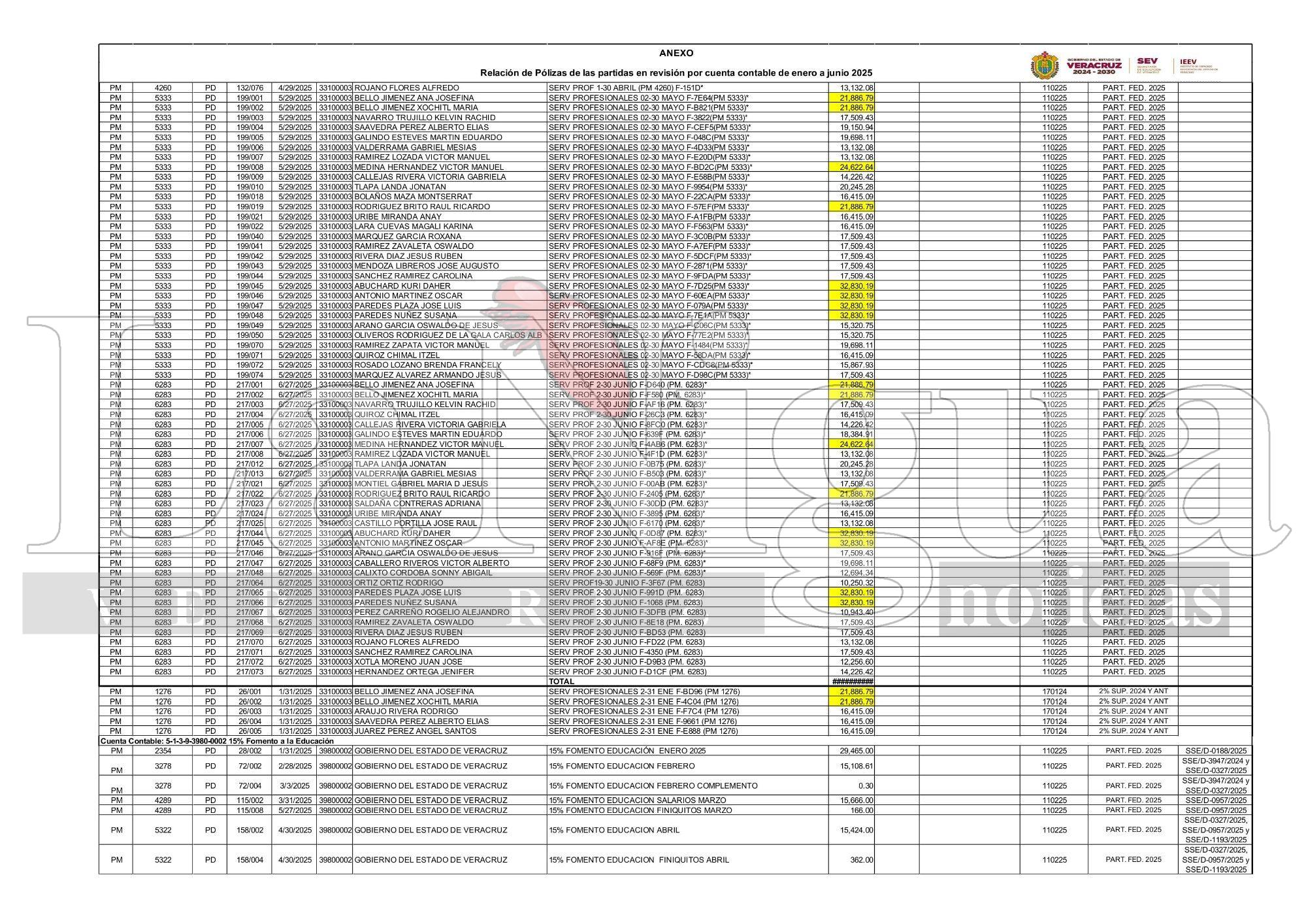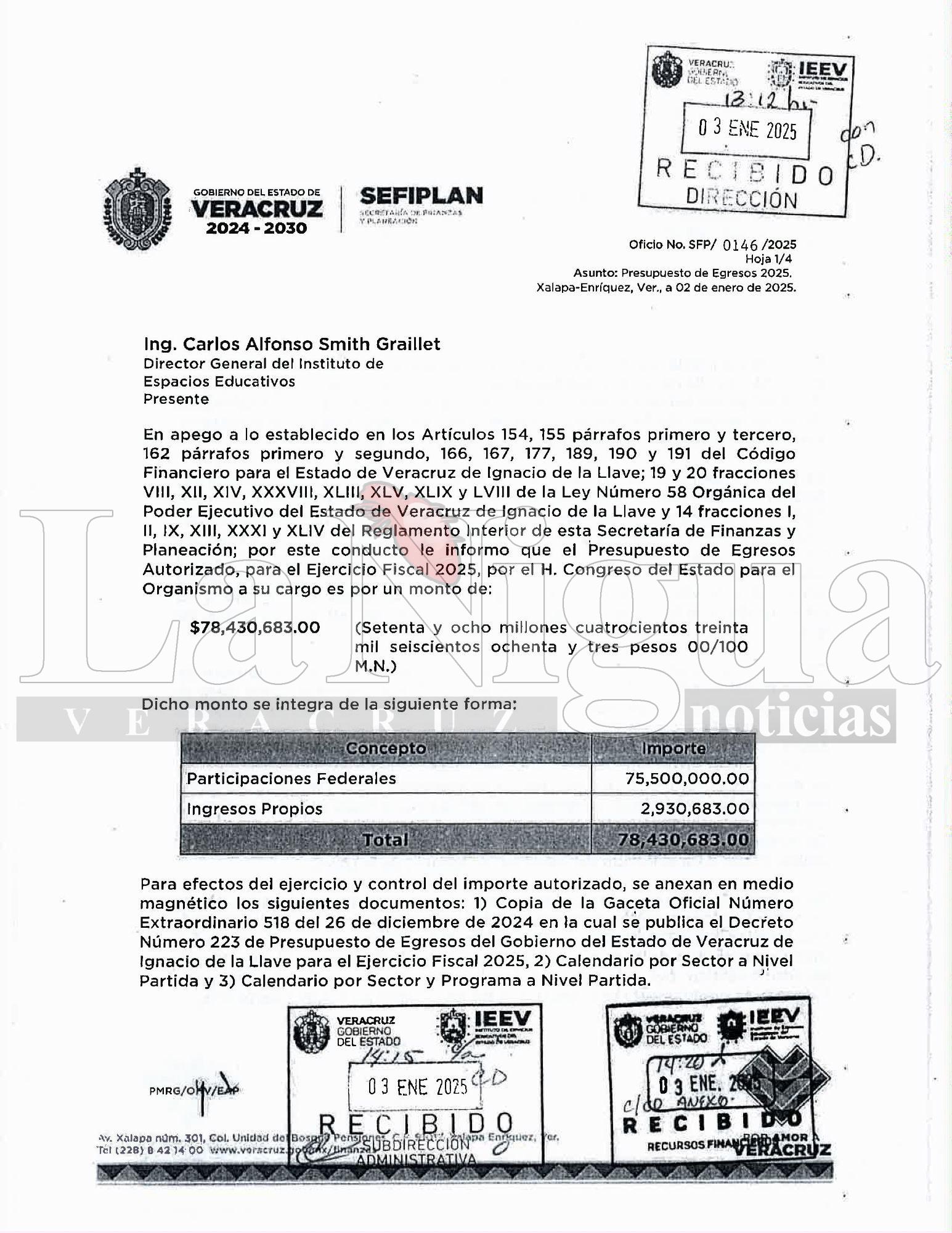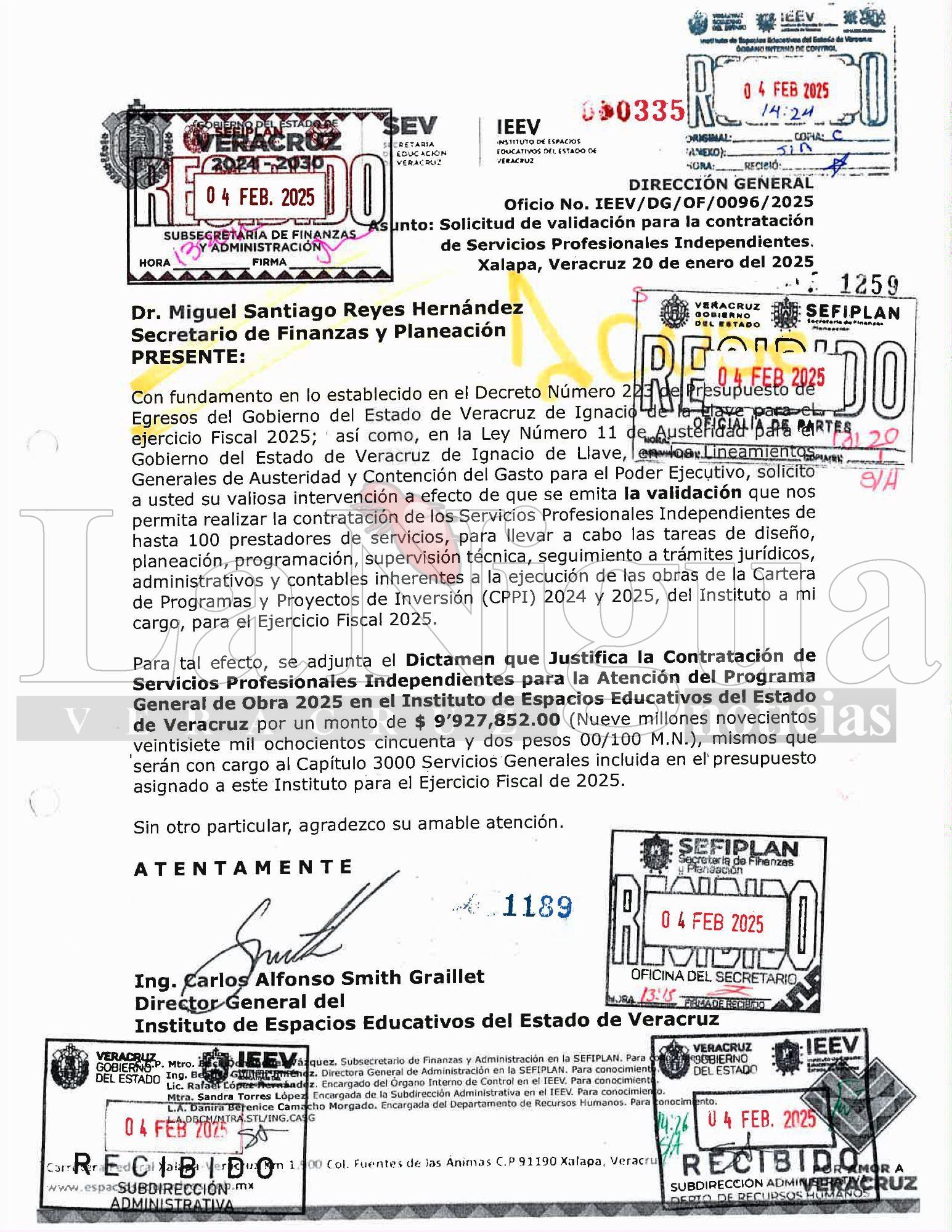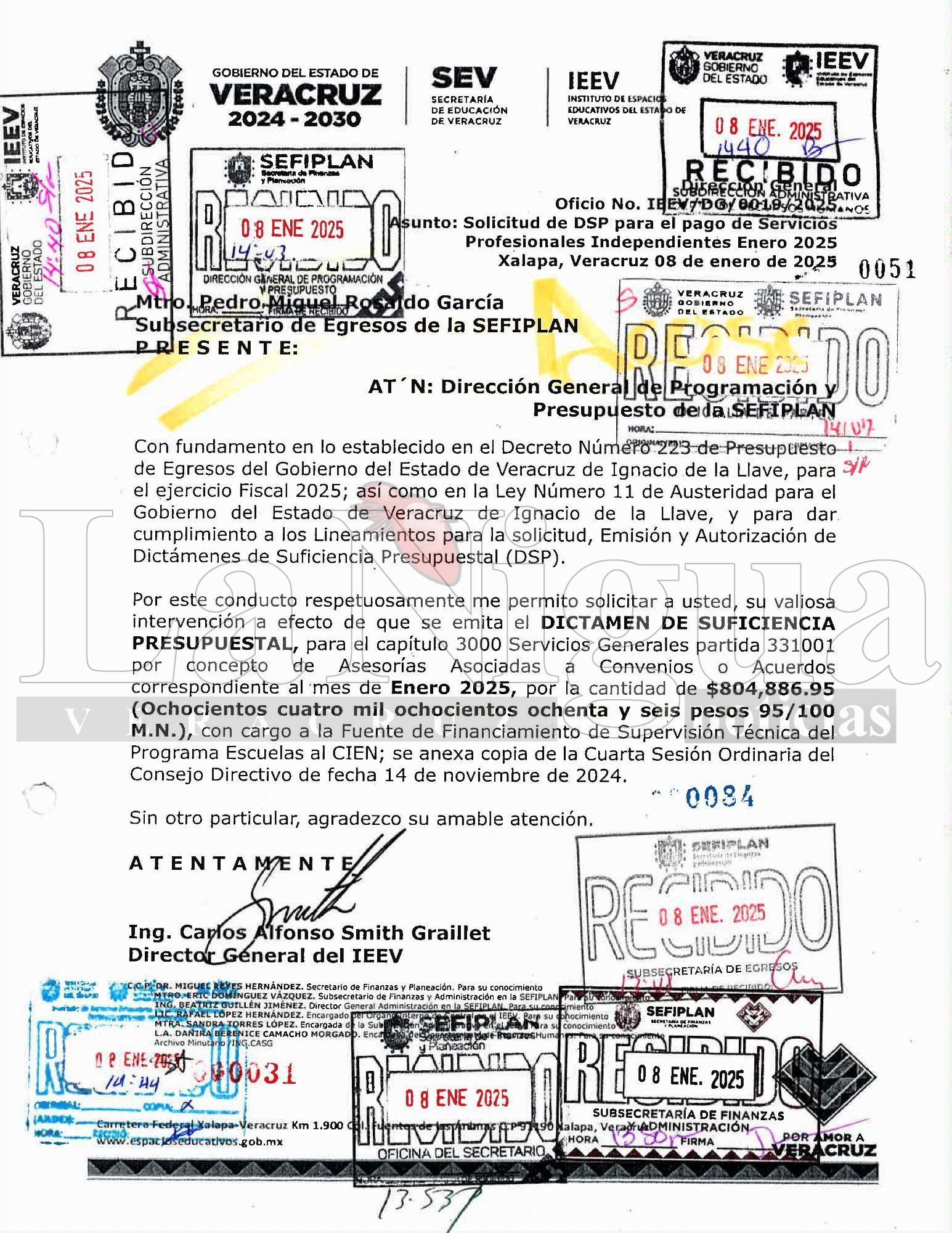 XALAPA,VER.-En un mensaje recibido en la redacción de este medio, nos hacen llegar documentos escaneados de órdenes de pago dirigidas a la Secretaría de Finanzas por parte de Carlos Alfonso Smith, director de Espacios Educativos.