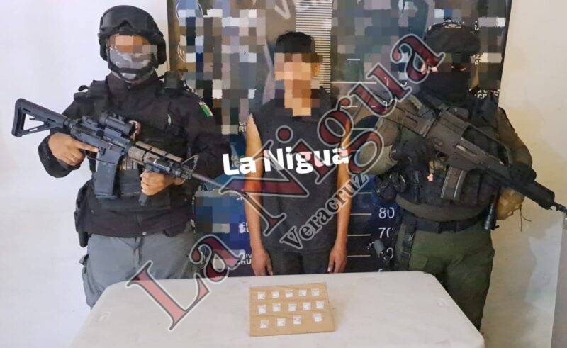 Paso del Macho Ver.- Elementos de la Fuerza Civil detuvieron esta media semana a un joven que portaba 14 bolsitas con material parecido a la droga conocida como “cristal”.