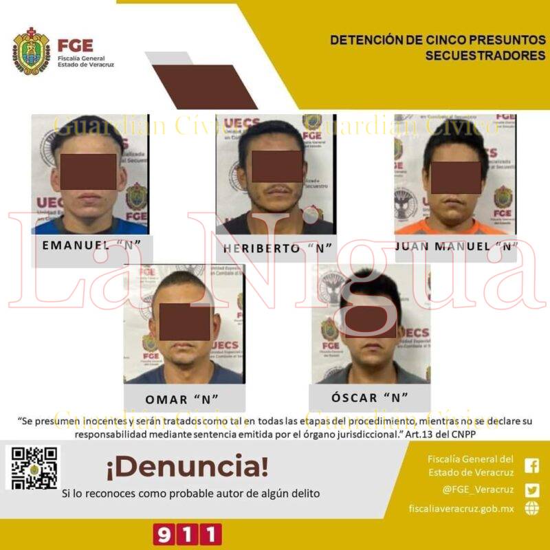 Cosamaloapan, Ver.- La Unidad Especializada en Combate al Secuestro en coordinación con elementos de la Secretaría de la Defensa Nacional detuvieron en flagrancia a Heriberto “N”, Juan Manuel “N”, Óscar “N”, Emanuel “N” y Omar “N” como presuntos responsables del delito de secuestro en Cosamaloapan y liberaron a dos personas que se encontraban privadas de su libertad.