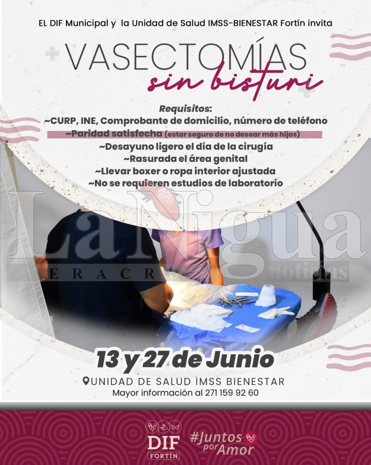 El DIF Municipal de Fortín y la Unidad de Salud IMSS-BIENESTAR antes Centro de Salud, los invita a participar en la “Jornada de Vasectomías sin bisturí” totalmente gratuitas, con el objetivo de fomentar la planificación familiar.