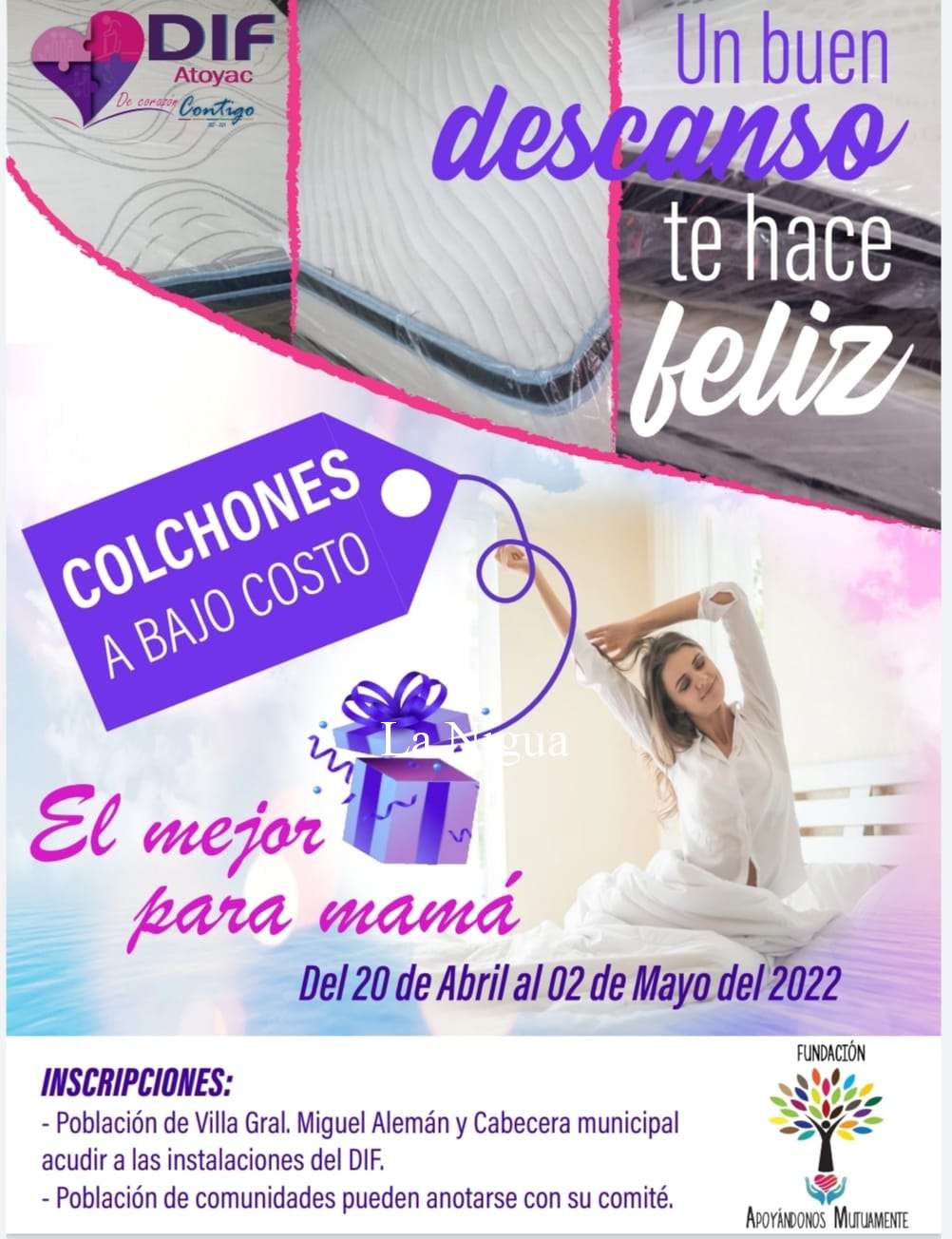 Las inscripciones cierran el lunes 2 de mayo y la entrega de los colchones se hará el 9 de mayo. En el caso de los habitantes de las comunidades de Atoyac que deseen participar podrán solicitarlo a su Comité Comunitario.