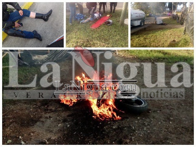 Coscomatepec.- Dos accidentes en cuestión de minutos se registraron a tempranas horas del lunes en la carretera federal, en ambos los involucrados fueron motociclista y los presuntos responsables se dieron a la fuga, desafortunadamente en uno; el motoquero sufrió múltiples fracturas en su pierna y su unidad se incendió.