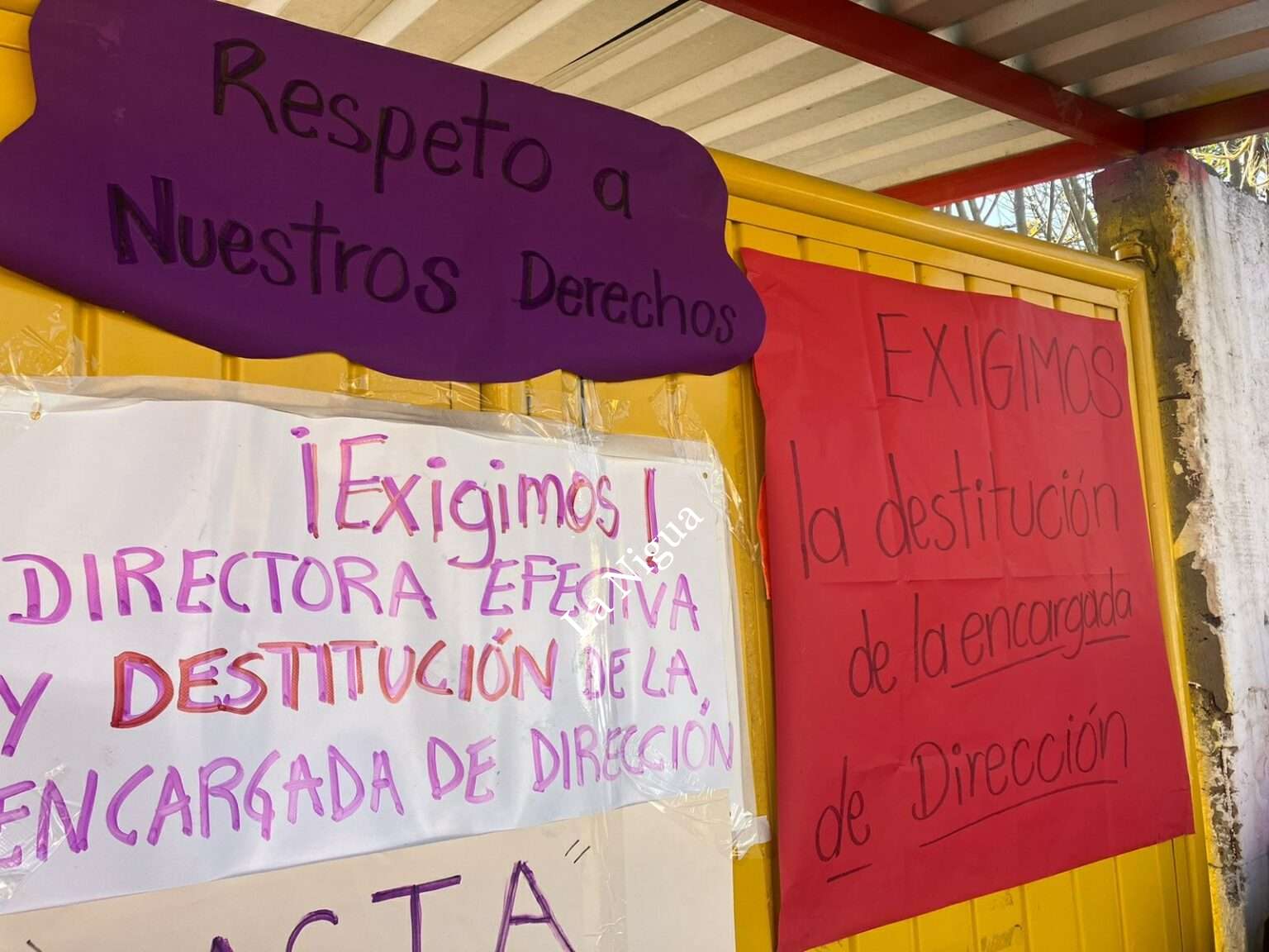 Los manifestantes colocaron cartulinas en el portón del plantel educativo, con varias consignas a su petición de que se vaya la encargada de la dirección, por último los docentes inconformes no se van a retirar del bloqueo hasta que la encargada de la dirección se retirada.
