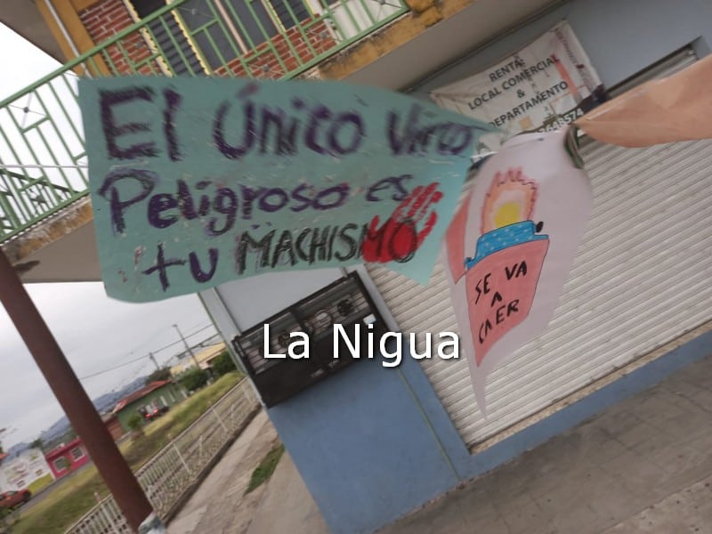 Cuando llegaron los barrenderos a su turno, ya estaba cerrado el kiosko con rafia y al centro había carteles con veladoras encendidas al pie de los .usamos, con frases como “hoy no están todas las voces porque desde la tumba no se puede”, “el feminismo no ha matado a nadie, el machismo lo hace a diario”, “el peor virus es tu machismo”.