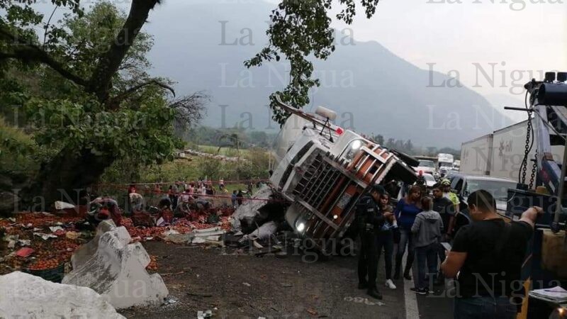 La tarde de ayer miércoles dos personas murieron en un accidente en el kilómetro 265 de la autopista Puebla-Orizaba a la altura del lugar conocido cómo “la curva de los marranos” cuando un camión tipo tortón cargado de tómate perdió el control y se salió de la cinta de rodamiento quedando volcado sobre su costado derecho.