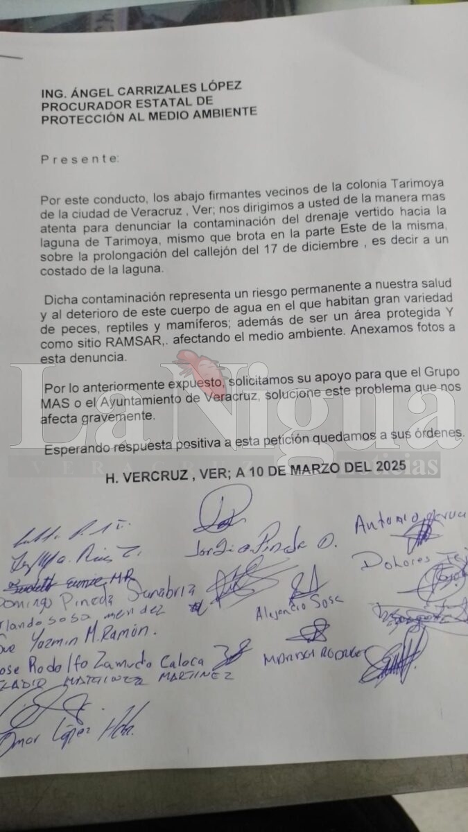 Veracruz, Ver.- Un oficio firmado el pasado 10 de marzo por vecinos de la zona norponiente del municipio de Veracruz solicita el apoyo de la Procuraduría de Medio Ambiente (PMA) para solucionar el vertimiento de aguas negras sobre la laguna de Tarimoya.