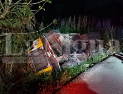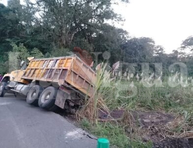 Córdoba, Ver.- El conductor de un camión de volteo que manejaba en aparente estado de ebriedad y que transportaba arena cuando circulaba a la altura del bulevar que comunica a la Unidad de Servicios Bibliotecarios USBI, al salir hacia la colonia Agustín Millán volcó al tratar de dar vuelta en un tramo de curva lo que provocó que terminara volcado.