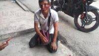Testigos indicaron que el ebrio sujeto intentó subir a su motocicleta tras salir de una cantina, sin embargo, perdió el equilibrio y cayó al suelo.