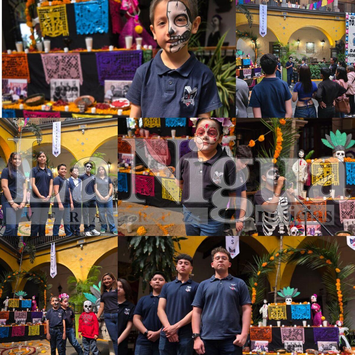 El altar fue instalado en el patio del Zevallos, lugar emblemático de la ciudad, y este año estuvo dedicado a honrar la memoria de los fundadores del colegio, quienes llegaron a México como parte del exilio español de 1939 y legaron una profunda vocación por la educación, la cultura y el humanismo.