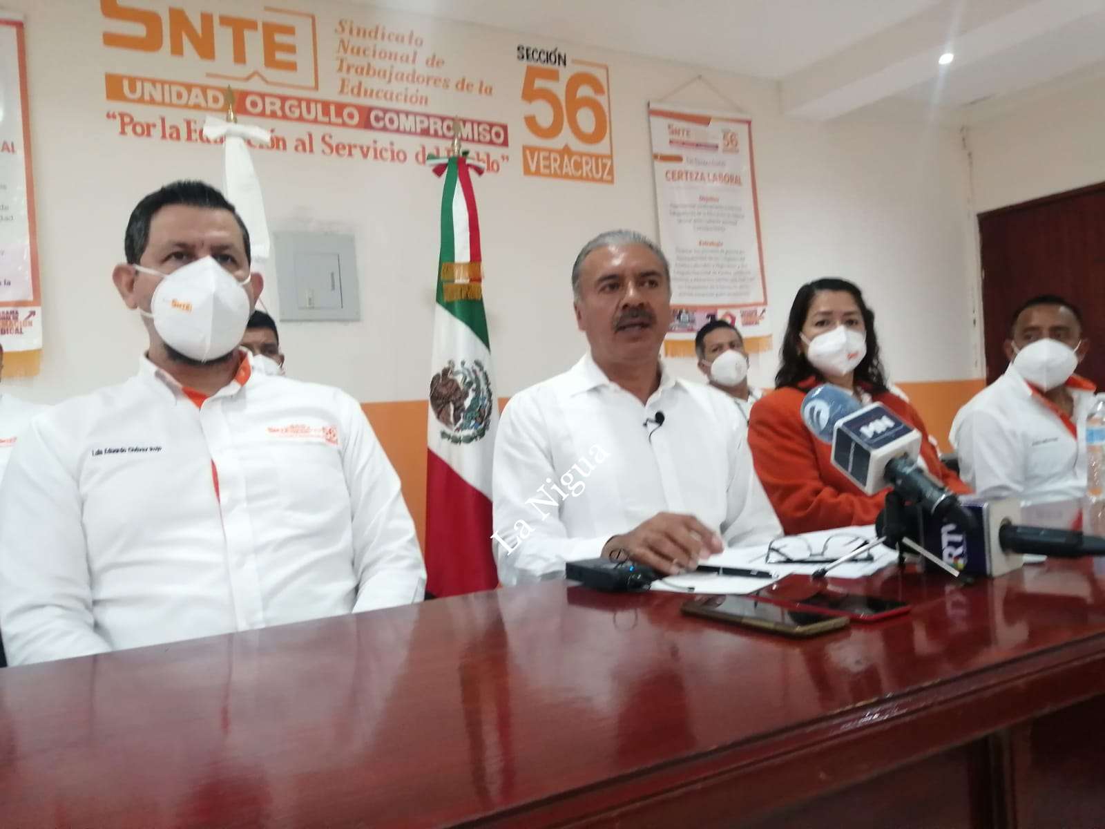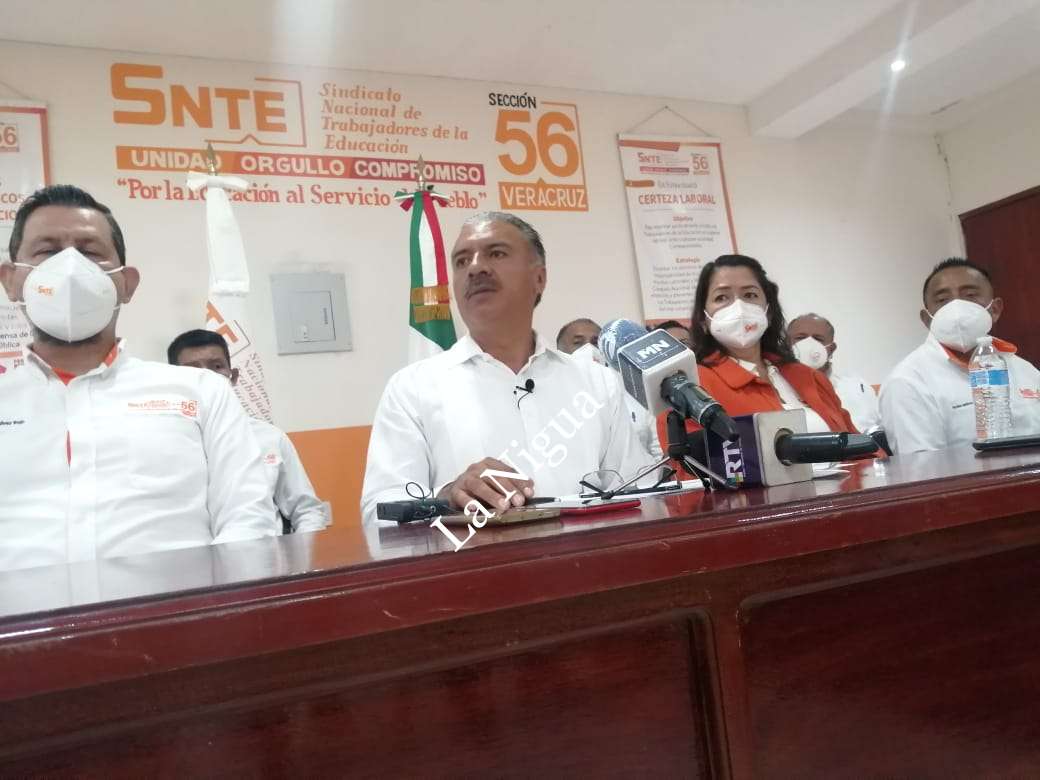 Xalapa, Ver.- En conferencia de prensa por parte del secretario general del Sindicato Nacional de Trabajadores de la Educación de la sección 56 del SNTE en Veracruz, José Reveriano Marín Hernández y acompañado por el colegiado de organización, el líder destacó “una de las prioridades que ha trazado esta directiva seccional sindical se basa en la certeza laboral y la seguridad social de sus agremiados, por lo que, mantienen una agenda permanente de trabajo con el Instituto de Pensiones del Estado (IPE), el Seguro Social de los Trabajadores de la Educación del Estado de Veracruz (SSTEEV) y el Instituto Mexicano del Seguro Social (IMSS), con quiénes permanentemente se realizan trámites en beneficio de los agremiados, entre algunos avances alcanzados están el pago del retroactivo inebe nivelación salarial de la promoción horizontal por niveles con incentivos en educación básica 2021 y la gestoría para la emisión de la misma convocatoria para el proceso 2022 la regularización administrativa de 832 compañeros de los diversos niveles educativos la basificacion de 32 trabajadores y 550 adiciones de maestros que han decidido formar parte de nuestra organización sindical”.